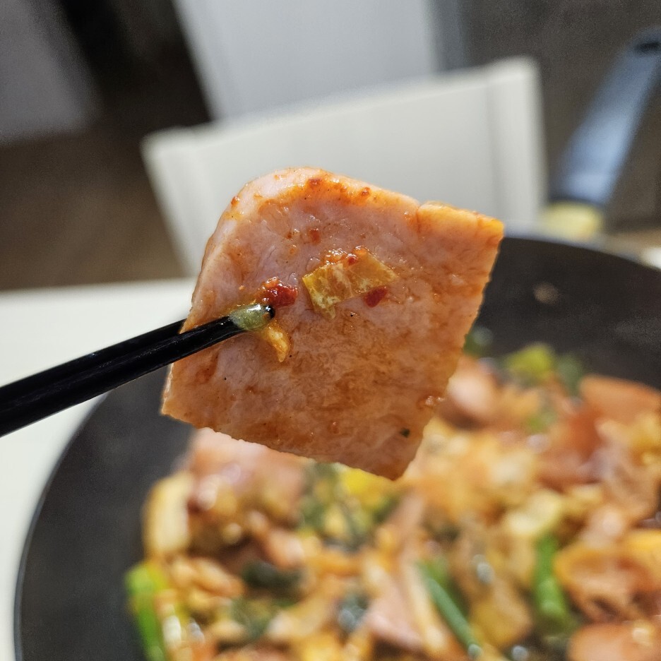 먼저 얇은 햄 한조각. 살짝 치즈가 뭍어 있어 더 맛있을 것 같다. 양념에 적절하게 볶아진 얇은 햄은 아주 부드럽게 씹혀 좋다.