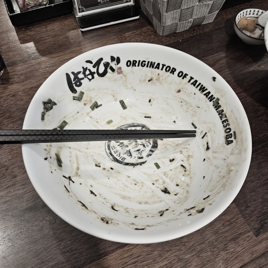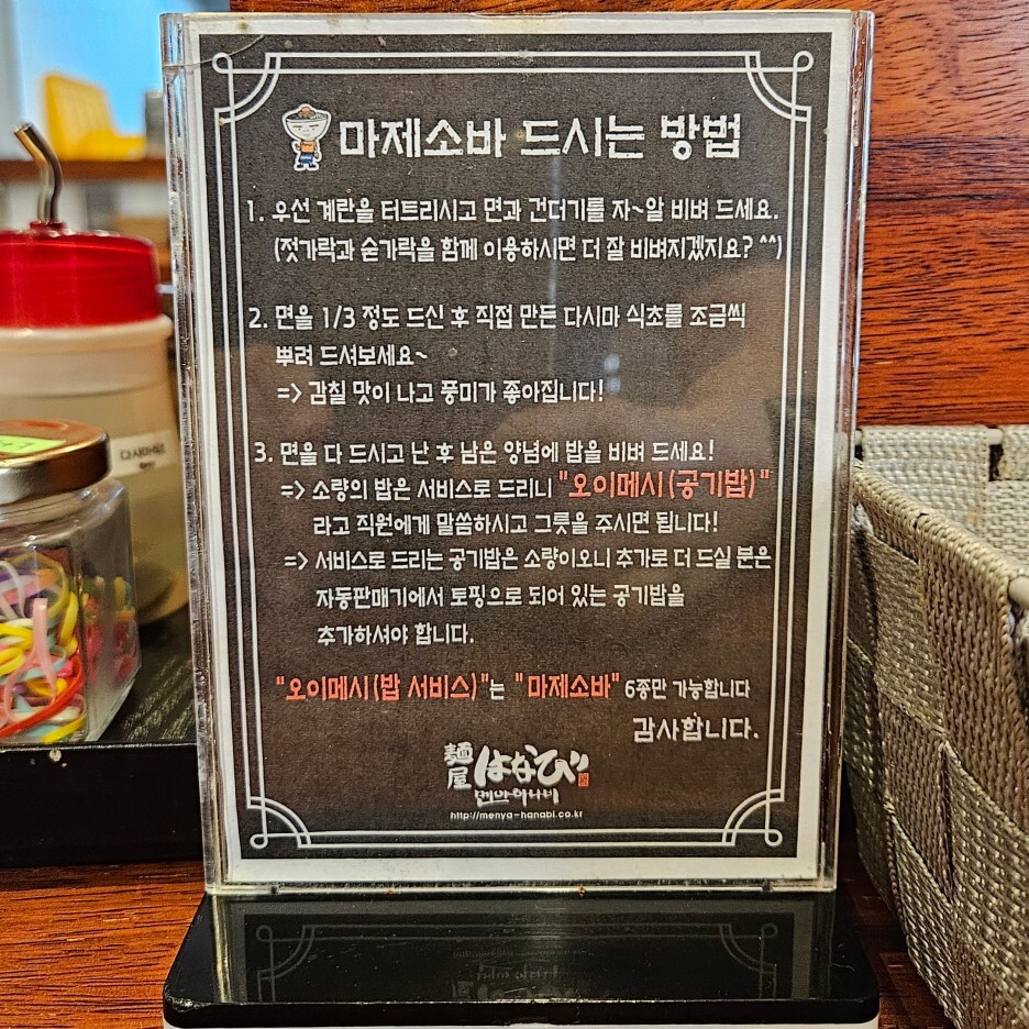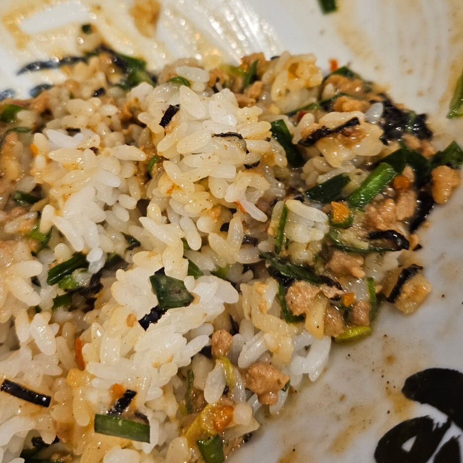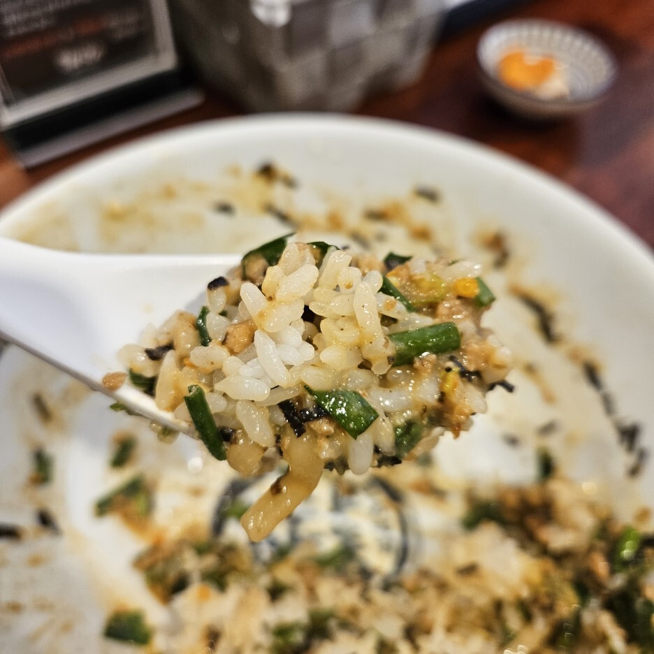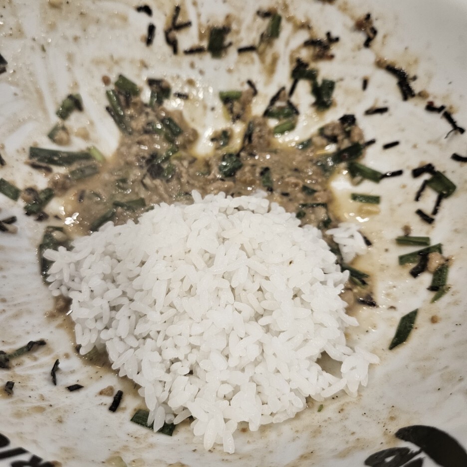 남은 소스에 밥을 비벼서, 또 다시마 식초를 추가하여 먹으면 훌륭하다. 맛있다. 아주 좋은 마무리다. 그런데, 멘야하나비의 한국 지점들은 공기밥을 따로 팔아서 그런지, 이렇게 딱 한번만 서비스 밥을 준다. 내가 먹었던 일본 나고야의 지점에서는 밥통이 있어서 그냥 무제한으로 먹을 수 있었다. 살짝 아쉬운 부분이다.