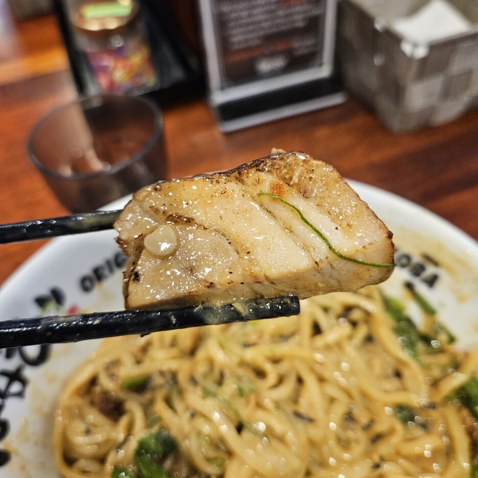 큼직한 고기 덩어리 들이 4개가 올라가 있다. 살짝 퍽퍽한 살들이 있는 챠슈이다. 역시 일본에서 먹는 챠슈보다는 조금 떨어지는 느낌이긴 했다.