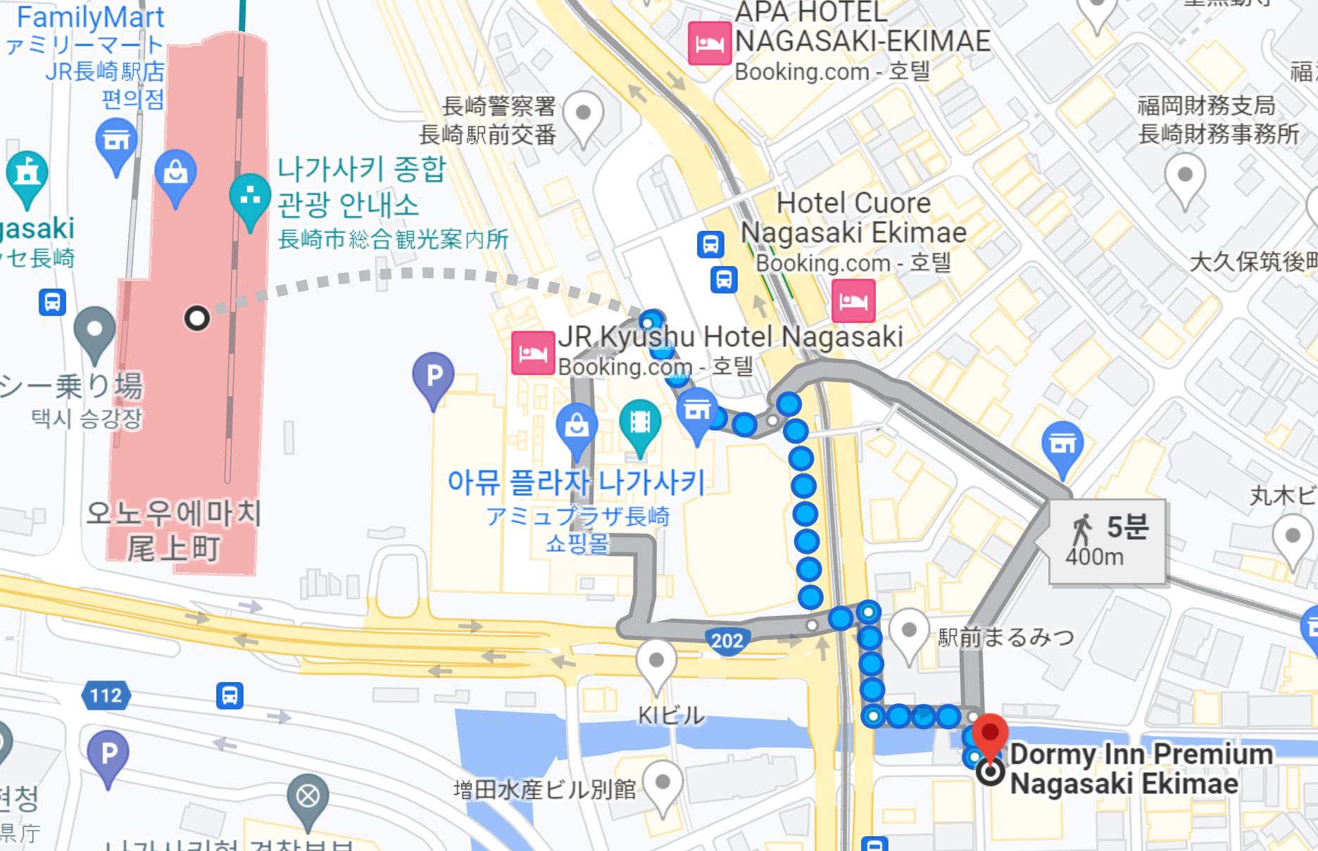 구글맵에서는 도보로 5분 거리라고 나오지만 실제 걸어보면 8분 정도는 걸렸던 거리이다. 2023년 3월 22일 현재 JR 나가사키역은 공사 중이라 여러 가지로 복잡하고 도로가 좀 어수선했기 때문이다.