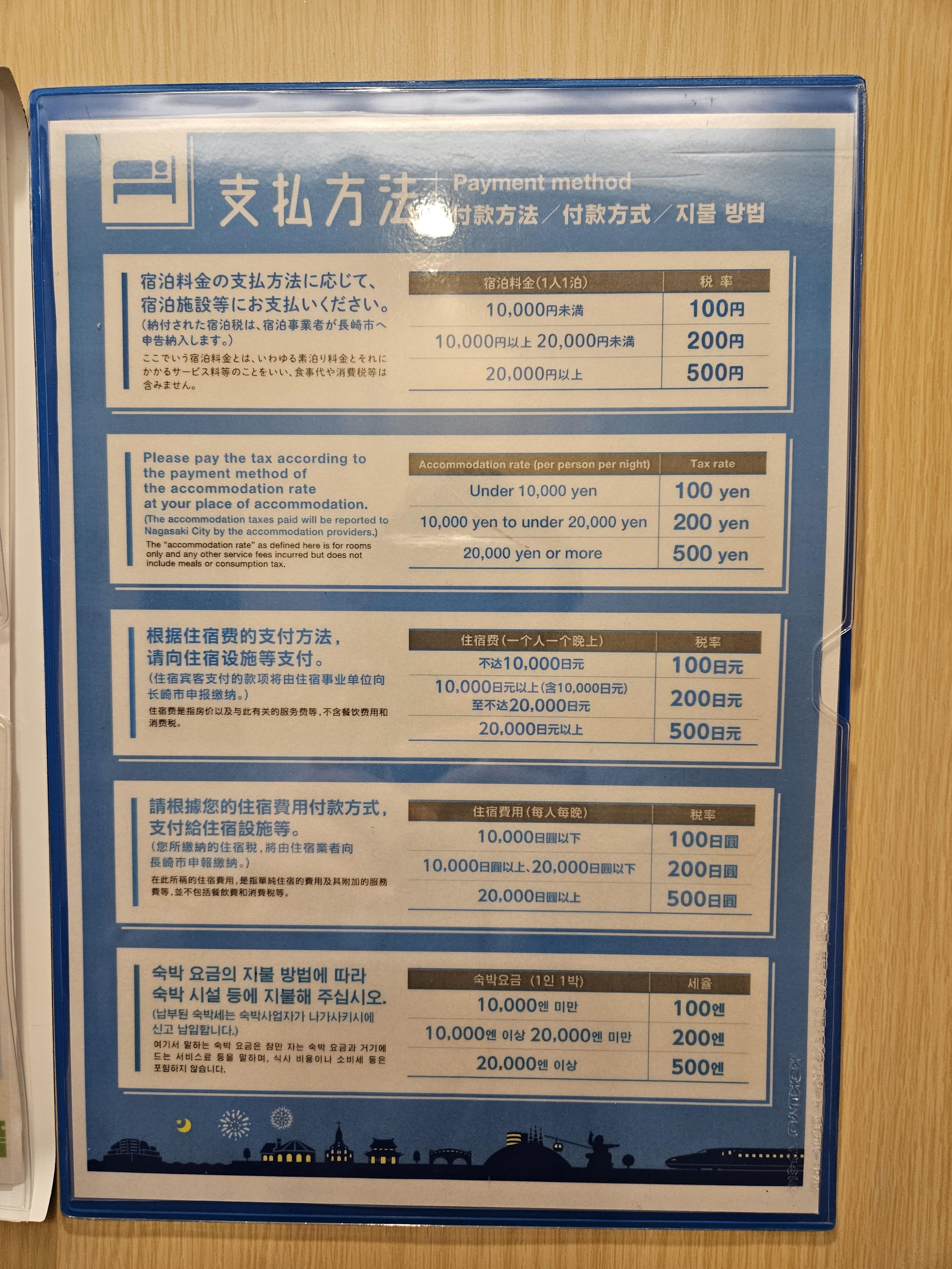 일본의 몇몇 도시에서는 숙박세를 받는다. 나가사키는 1인 1박당 100엔 이었다.
