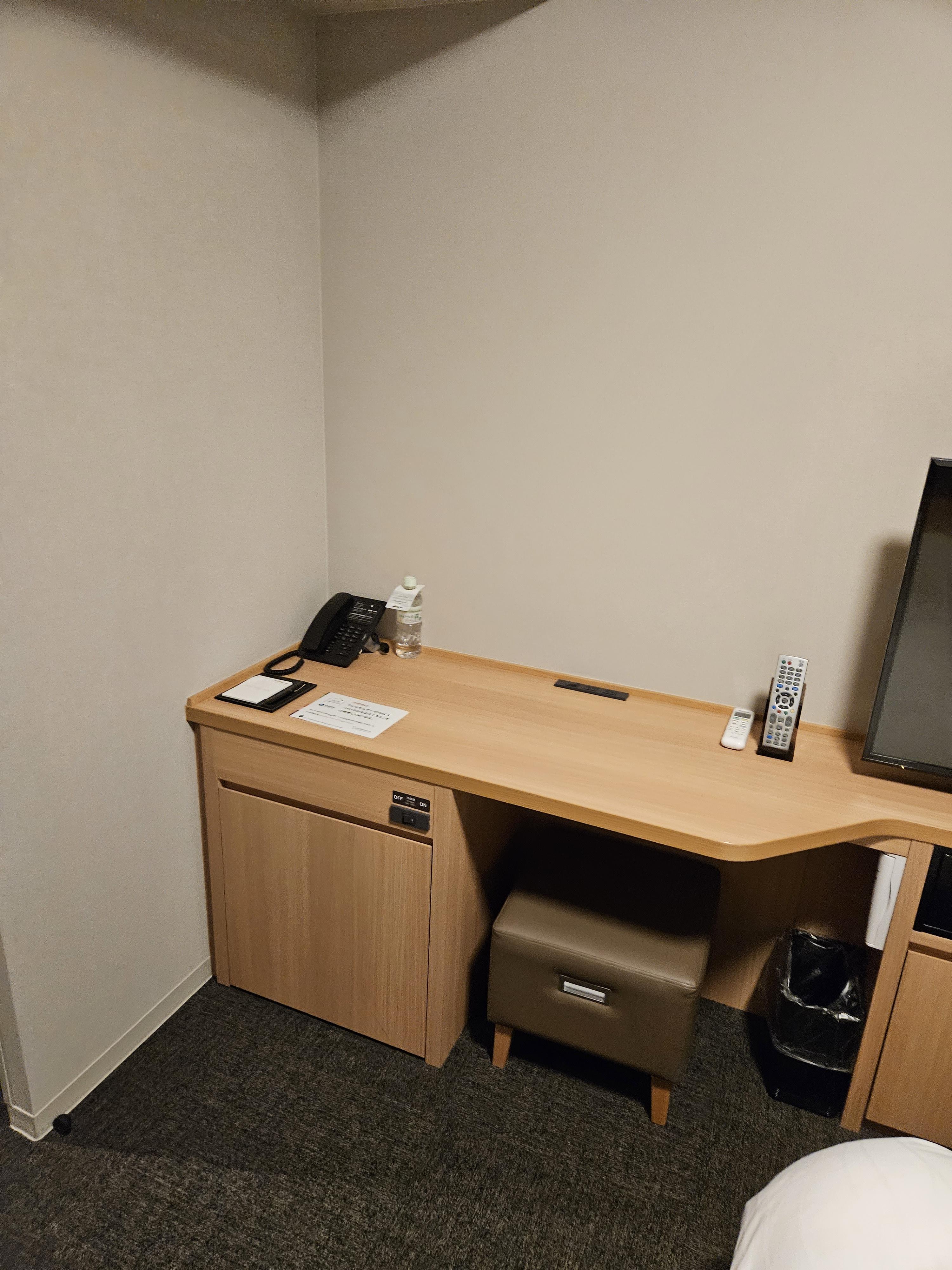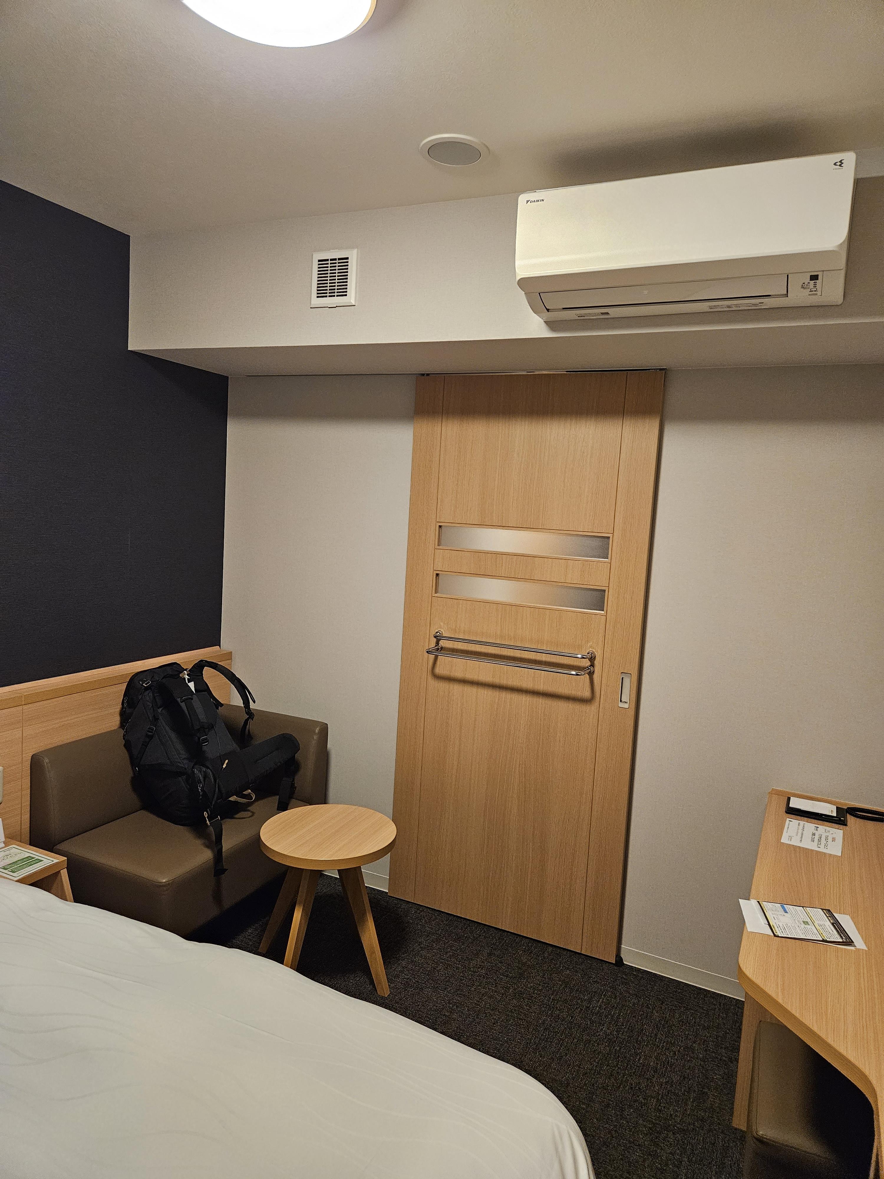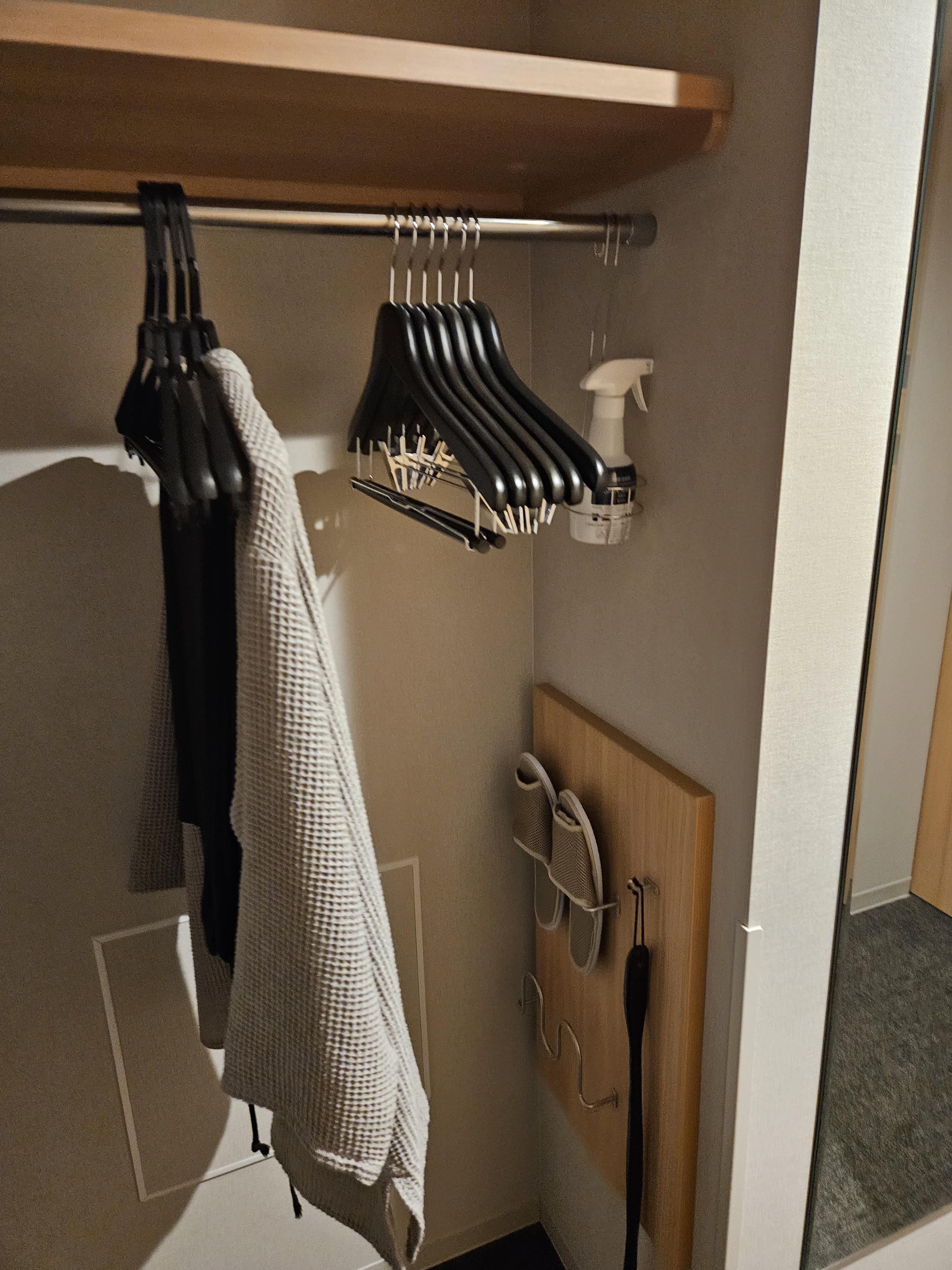 외부문을 열고 들어가면 왼쪽에 바로 옷걸이와 실내화 섬유탈취제가 있다. 일본 호텔들은 거의 모두 섬유탈취제가 있어서 너무 좋다. 여행자의 특성상 옷을 많이 가져 다닐 수 없어, 부득이하게 여러 날을 하나의 옷으로 버텨야 할 경우가 있는데, 이럴 때 너무나 유용하다.