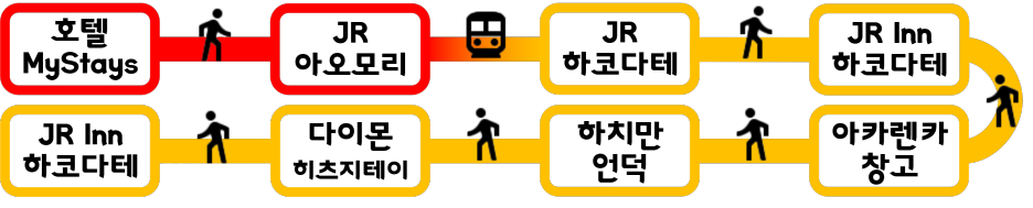 호텔 마이스테이즈 아오모리 에키마에 → 아오모리역 → 하코다테역 → JR 인 하코다테 → 카네모리 아카렌카 창고 → 하치만자카 → 다이몬 히츠지테이 → JR Inn 하코다테