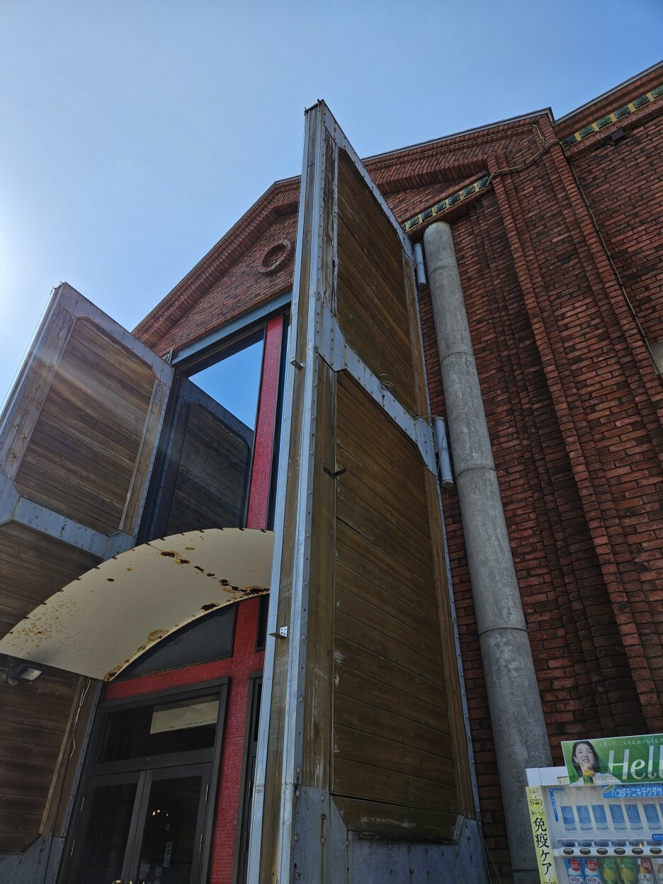 밖으로 나와서 보는 아카렌카 창고 풍경. 건물에 모두 수풀림 森 한자가 적혀져 있는데, 이 창고를 소유한 회사인 카네모리모리야(金森森屋) 회사의 상표라고 한다.