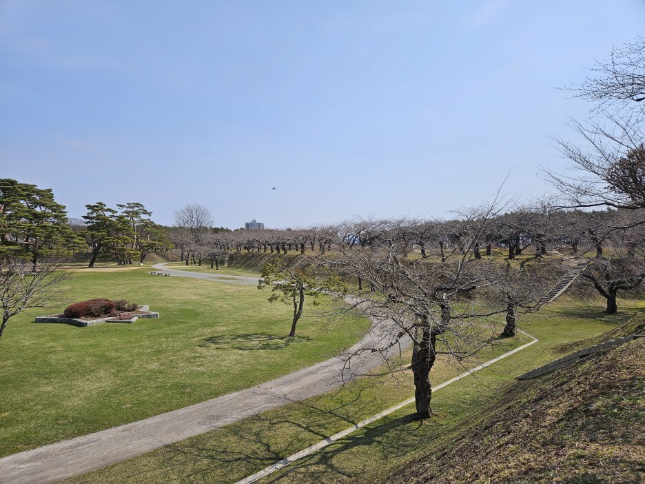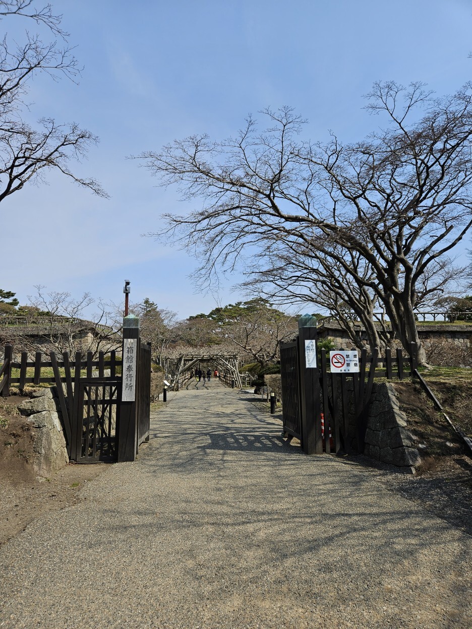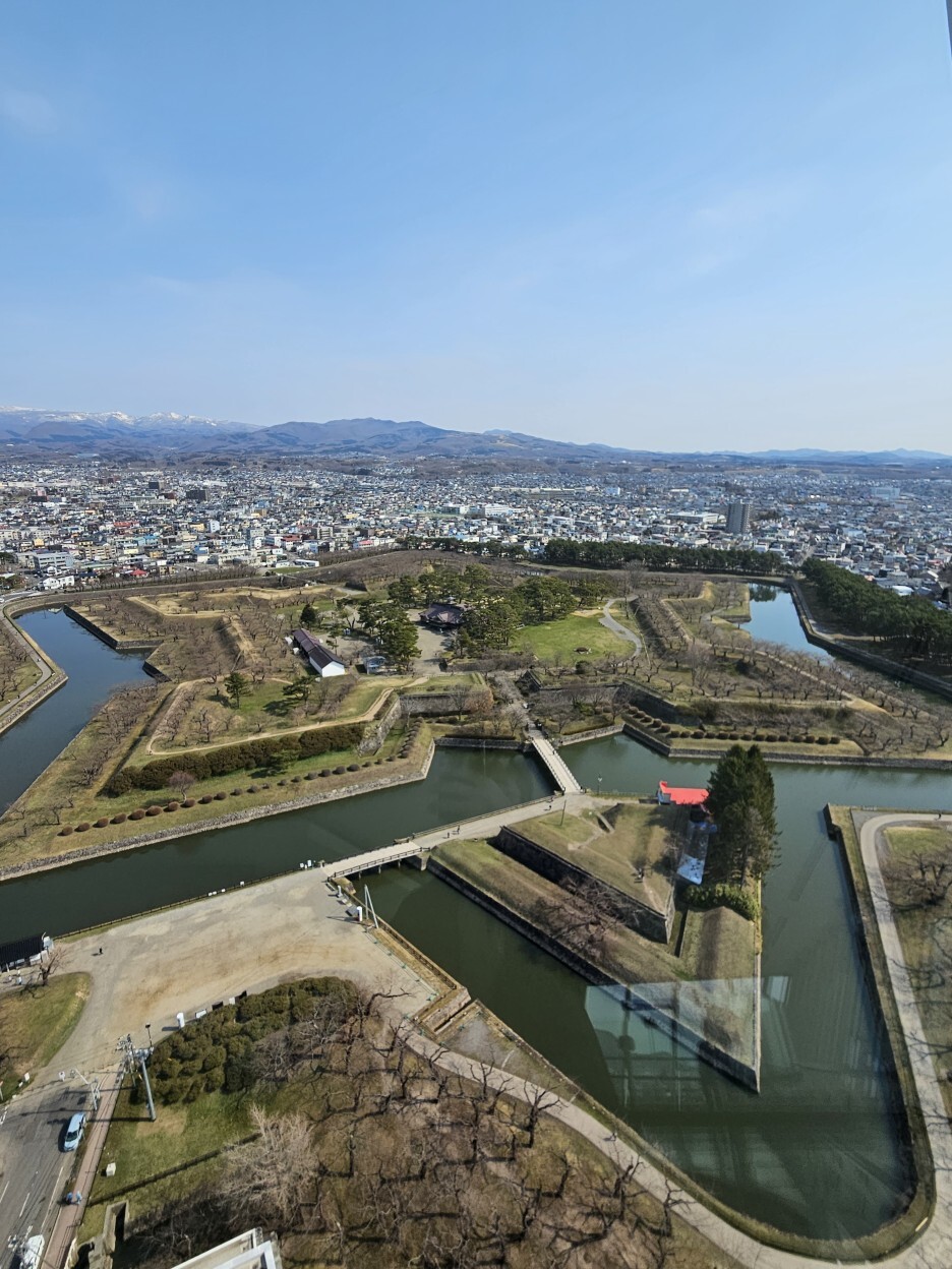 고료가쿠 공원이 눈앞에 펼쳐져있다. 5각 별모양의 특이한 형태의 구조의 성곽이다. 이 때는 이렇게 만드는 것이 전쟁에서 유리하다고 생각했나 보다. 주변의 넓게 있는 해자의 모습도 멋있다.