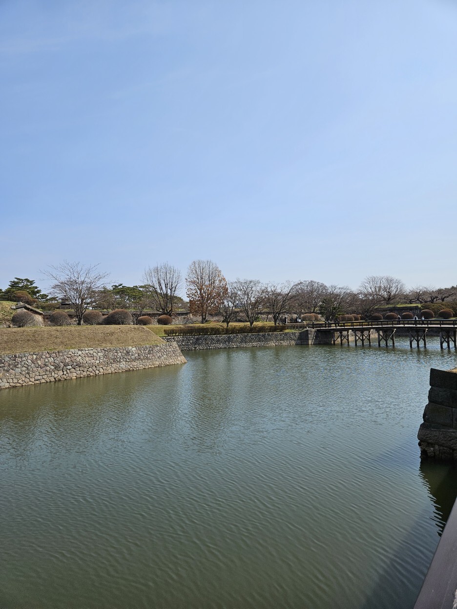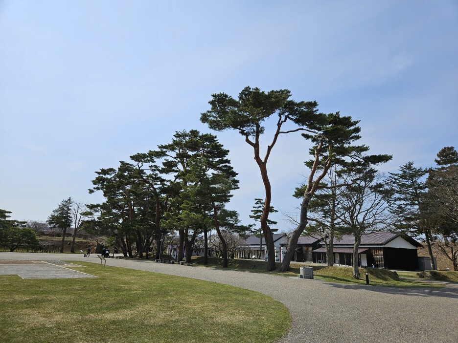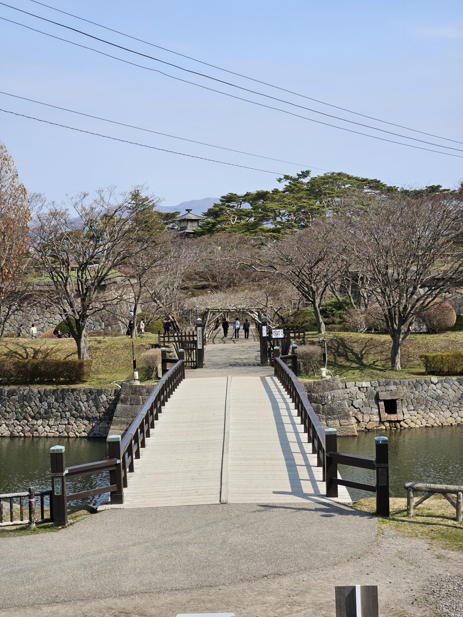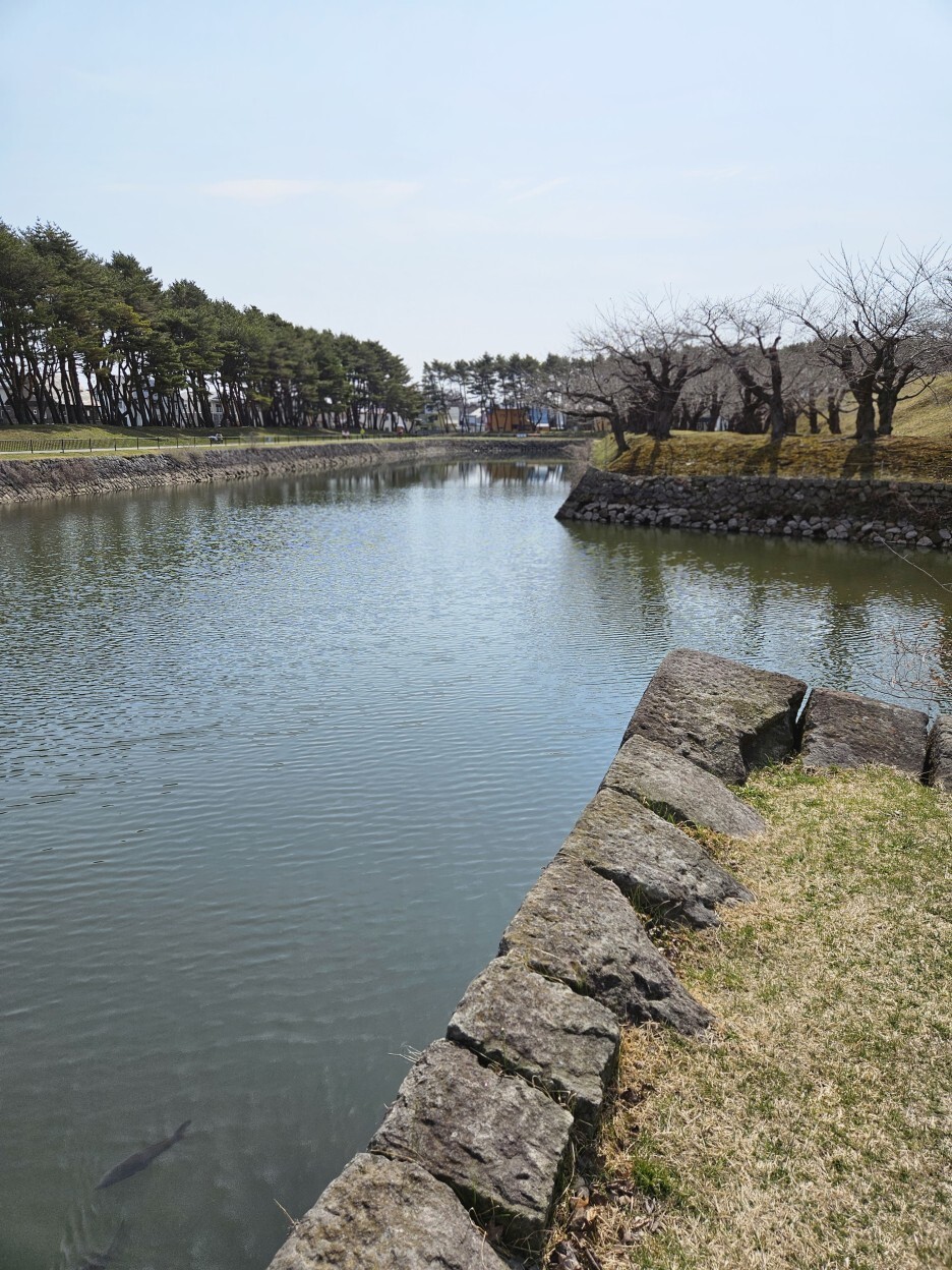 고료가쿠 공원이 눈앞에 펼쳐져있다. 5각 별모양의 특이한 형태의 구조의 성곽이다. 이 때는 이렇게 만드는 것이 전쟁에서 유리하다고 생각했나 보다. 주변의 넓게 있는 해자의 모습도 멋있다.