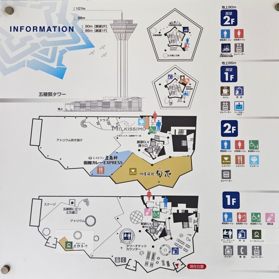 간략한 내부 안내도. 1층은 입장권 판매소와 타워를 올라가는 엘레베이터가 있다. 이외의 공간은 거의 모두 기념품을 판매하는 곳이다. 2층은 주로 식당 등이 있다.