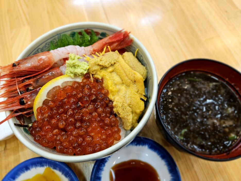 내가 선택한 메뉴는 삼색돈부리. 생새우, 성게, 연어알로 구성된 카이센동이다.