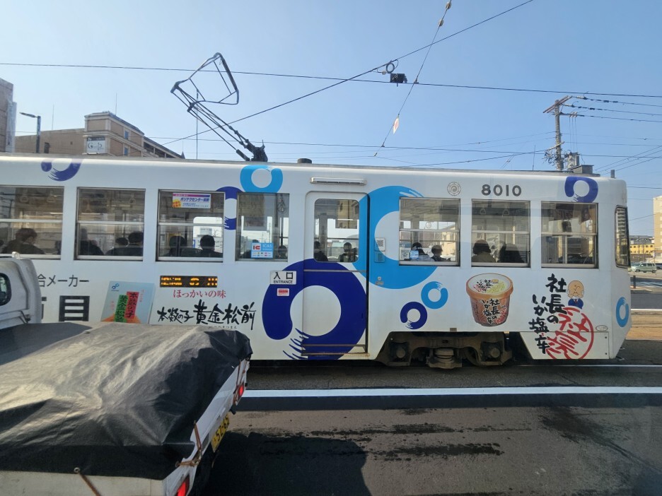 그런데 눈에 띄이는 것은 노면전차. 일본의 소도시에는 이런 노면 전차가 참 많다. 나가사키에서만 한번 타보고 다른 도시들에서는 전부 도보 이동이나 버스를 이용했다. 노면 전차가 관광하는 느낌이 나서 좋긴 하지만, 좀 느린편이다.