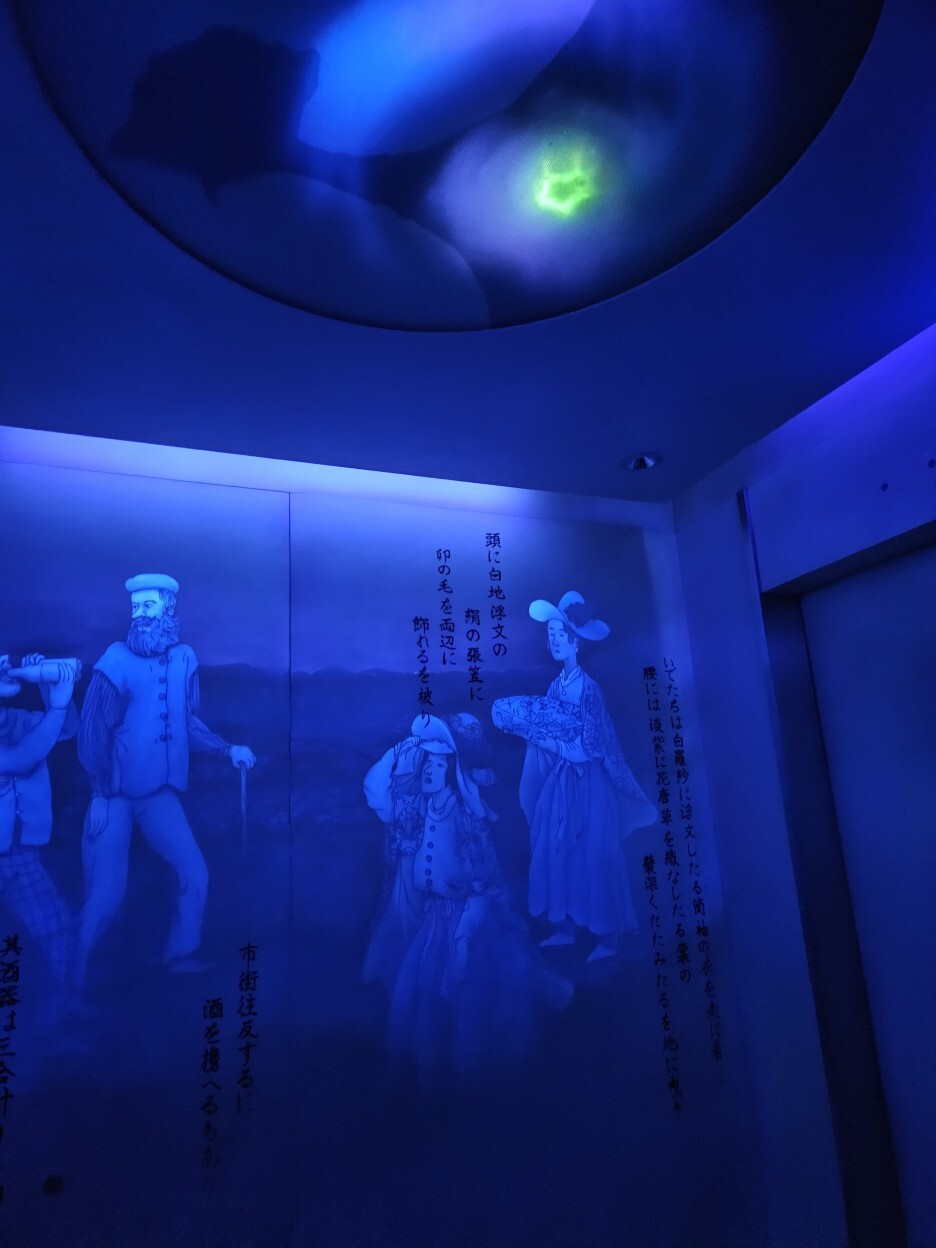 타워로 올라가는 엘레베이터 안은 뭔가 오묘한 분위기의 조명을 비추니 일반 조명에서는 보이지 않던 모습이 보였다. 하코다테의 역사에 관련된 내용인듯 하다.