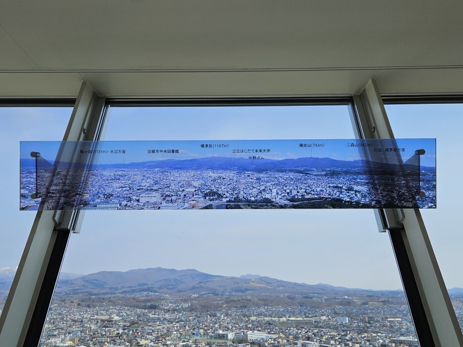 워낙 주변에 높은 건물이 없는 도시 하코다테이다 보니, 상대적으로 크게 보일 뿐. 안테나를 포함한 최고 높이가 107m 정도이다.
