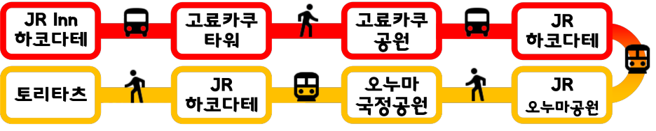 JR Inn 하코다테 → 돈부리 요코초 시장 마코토야스베 → 고료카쿠 타워 → 고료카쿠 공원 → 하코다테역 → 오누마 공원역 → 오누마 국정공원 → 하코다테역 → 야키토리 토리타츠 → JR Inn 하코다테