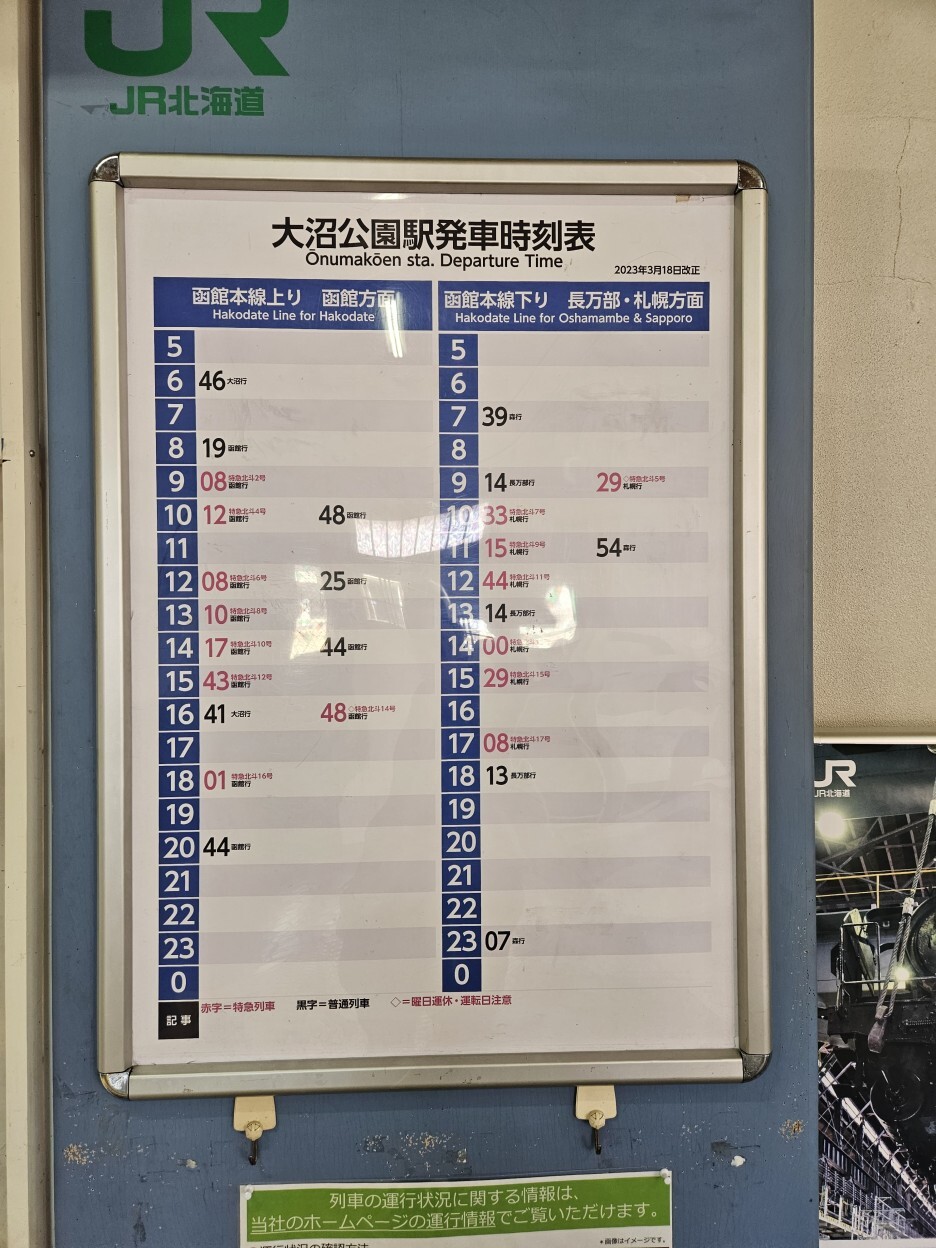 오누마공원역의 열차 시간표이다. 1시간에 한 대도 오지 않을 때도 있는 아주 작은 역이다. 이곳을 오려면 반드시 열차시간을 정말 정확하게 확인하고 와야 한다.