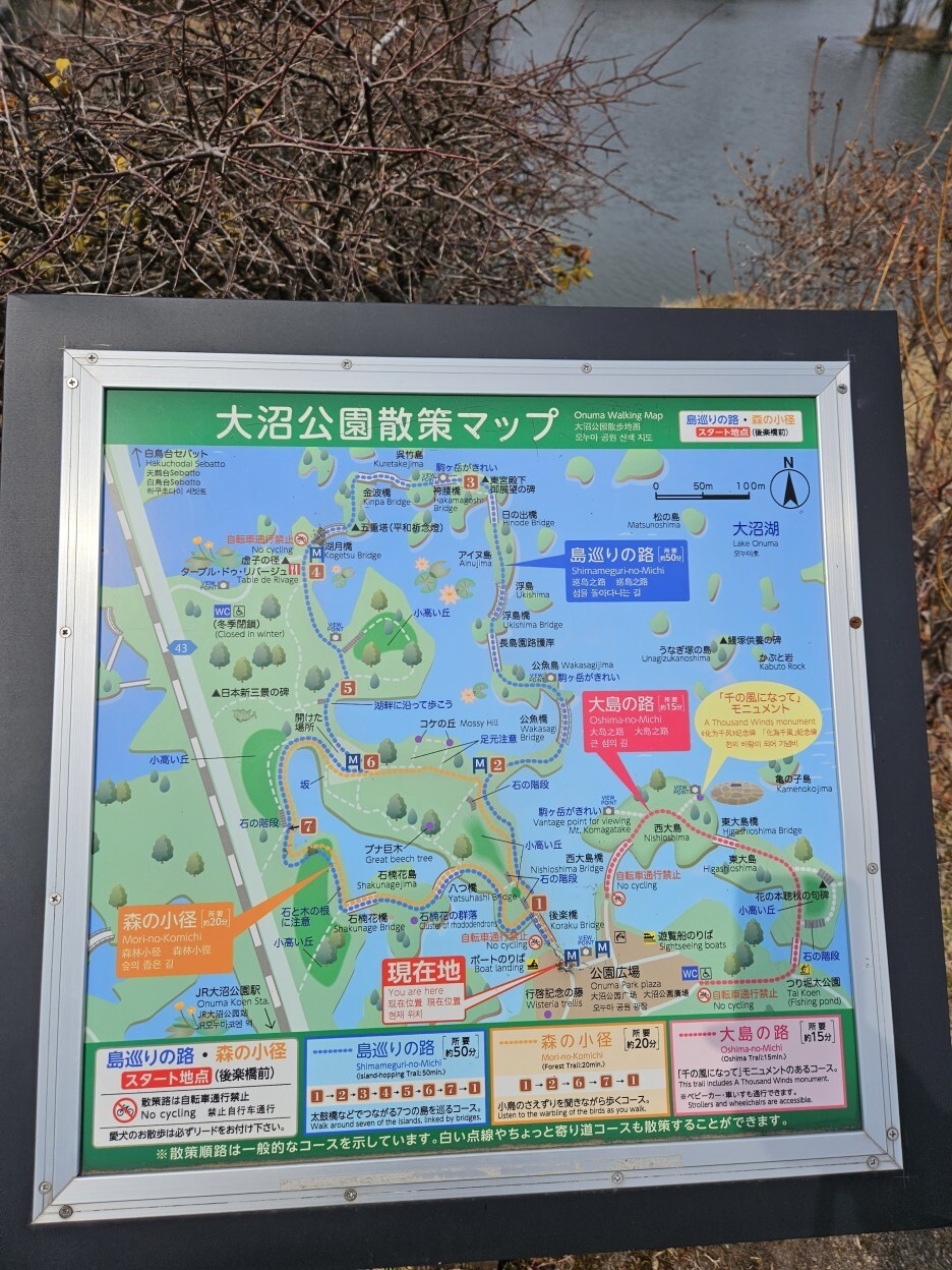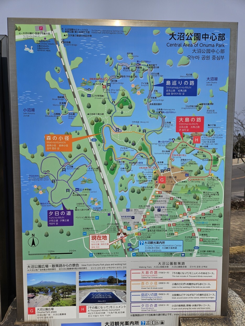이쪽은 오누마공원 중심부의 지도. 보통 도보로 다니게 된다면, 여기서 표시하고 있는 산책 코스를 따라서 이동하면 된다.