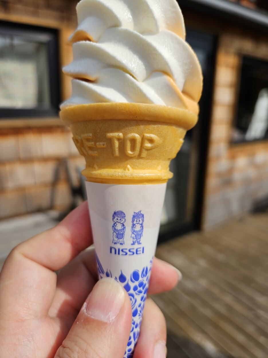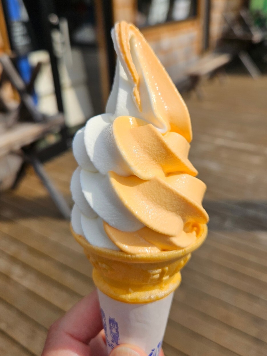 홋카이도는 유제품들이 유명하다. 그리고 주황색의 멜론인 유바리 멜론도 유명하지. 그래서 나는 바닐라와 유바리 멜론 믹스의 아이스크림으로 골랐다.