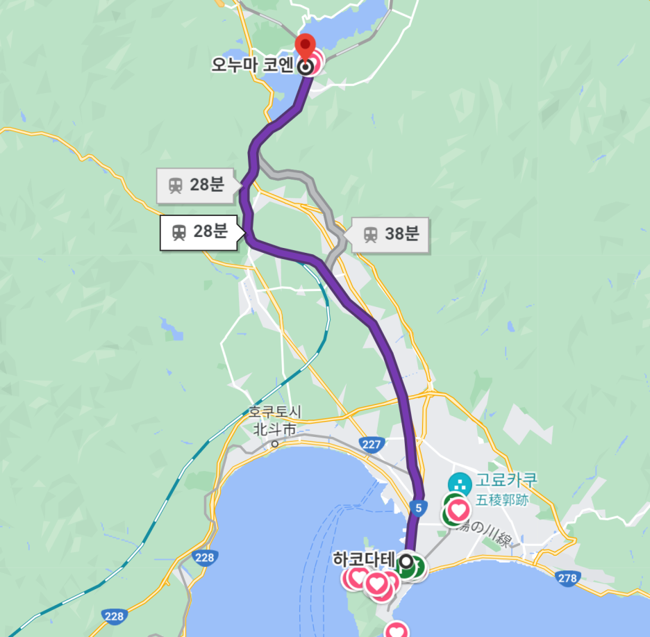 JR Inn 하코다테 → 돈부리 요코초 시장 마코토야스베 → 고료카쿠 타워 → 고료카쿠 공원 → 하코다테역 → 오누마 공원역 → 오누마 국정공원 → 하코다테역 → 야키토리 토리타츠 → JR Inn 하코다테