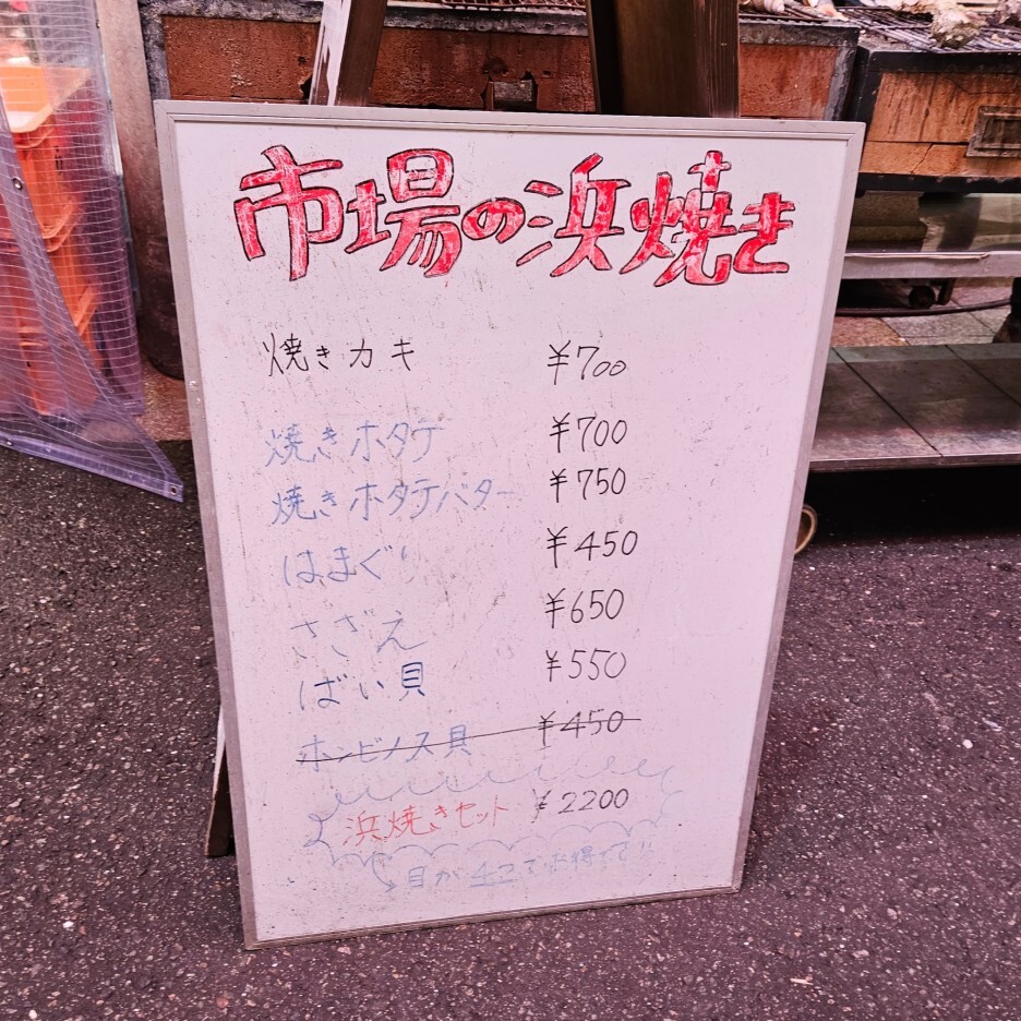 아래는 시장의 하마야키 판매 리스트. 굴, 가리비, 백합, 뿔소라 등 모두 조개류가 적혀져 있다. 그리고 실제 굽는 하먀야키의 모습들을 모두 조개류를 숯불에 굽고 있는 모습이다.
