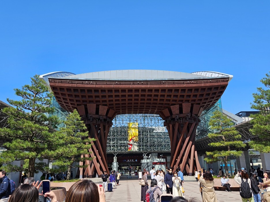 화창해진 날씨에 많은 사람들이 가나자와역의 오모테나시 돔을 사진에 담고 있다. 날씨가 좋으니 훨씬 멋있어 보이는 느낌이다.