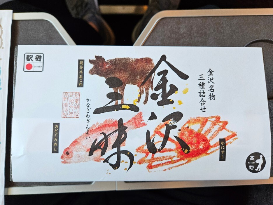가나자와에서 유명한 명물 3가지 재료로 만들어진 도시락으로, 게, 소고기, 금태를 사용했다. 우리나라 동해와 맞닿아 있는 곳이라 대게와 금태가 유명하다고 한다. 그리고, 일본은 지역별로 소고기와 돼지고기에 이름을 따로 붙여 브랜드화 시킨 것들이 많다. 가나자와 소고기도 그중에 하나.