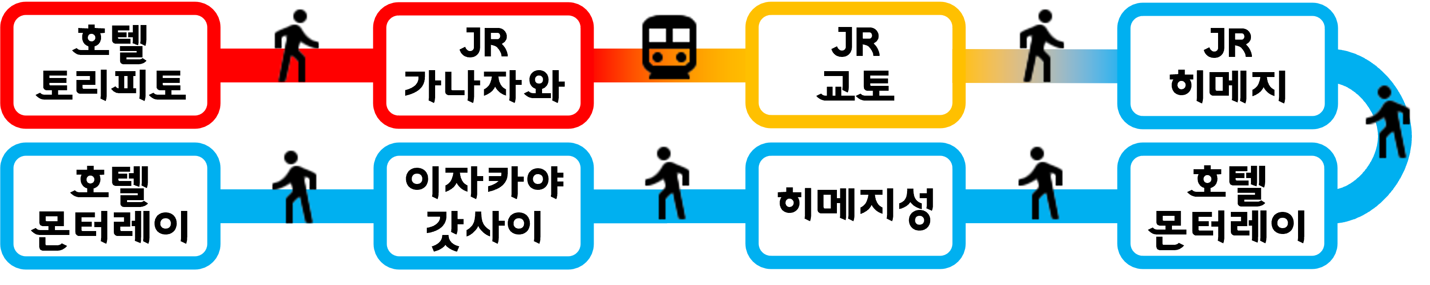 호텔 토리피토 가나자와 → 가나자와역 → 교토역 → 히메지역 → 호텔 몬테레이 히메지 → 히메지성 → 이자카야 갓사이 → 호텔 몬테레이 히메지