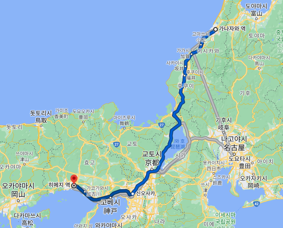 가나자와에서 히메지까지는 약 355km의 거리로, 열차 탑승 시간만 3시간이 조금 넘는다. 시간이 많이 걸리는 이유는 가나자와에서 간사이 지방으로 가는 신칸센은 없기 때문에, 일반 JR 특급 열차를 탑승해야 하기 때문.