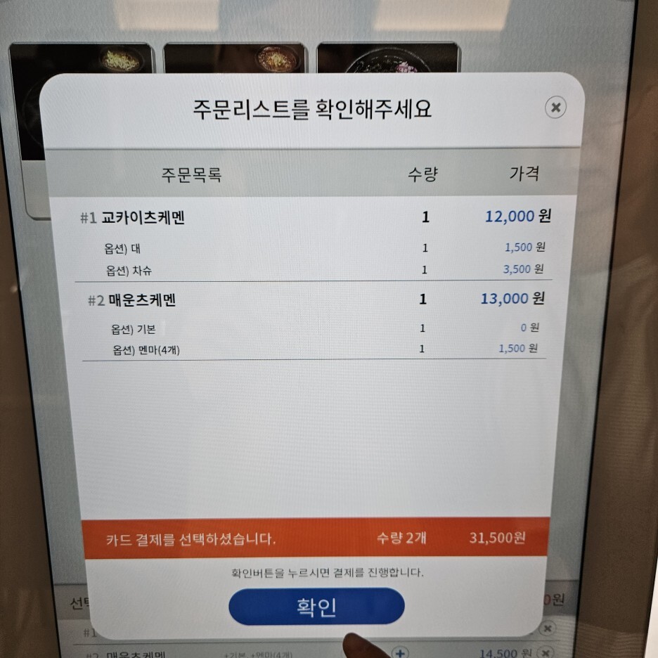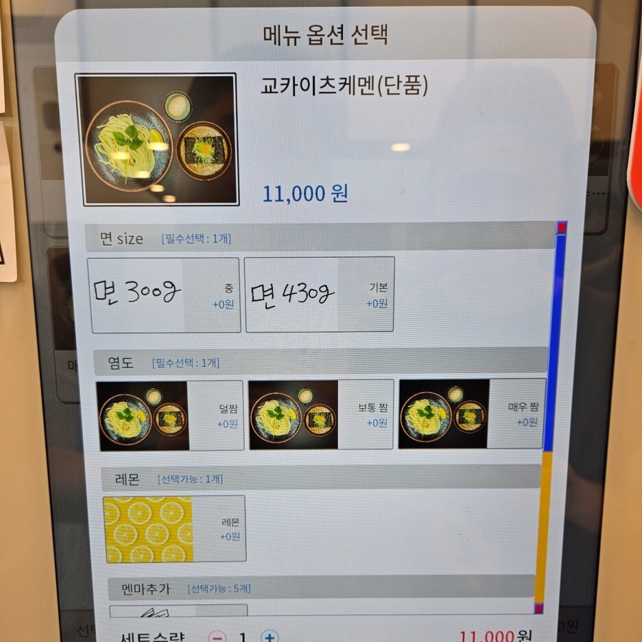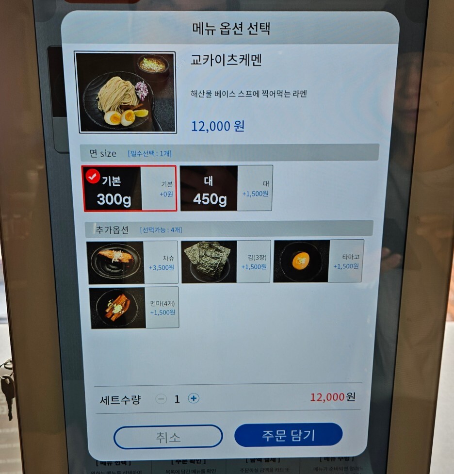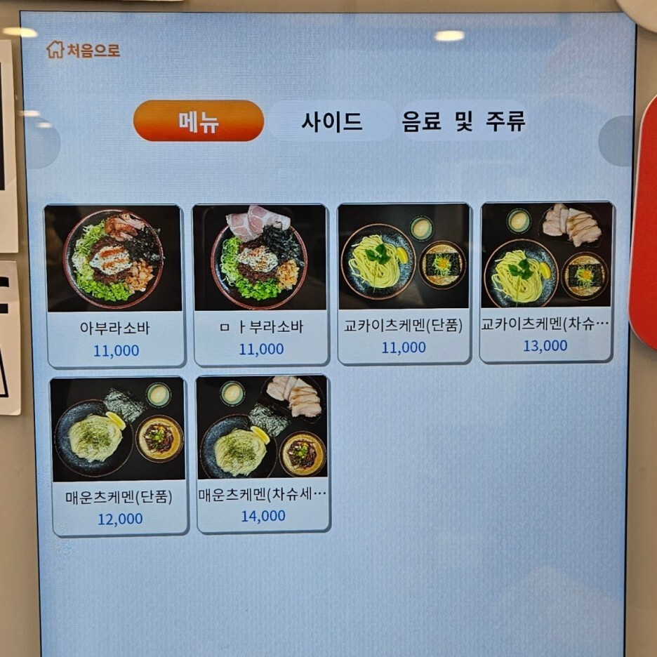 주문은 키오스크, 셀프 오더 시스템이다. 교카이 츠케멘, 매운 츠케멘, 마제 소바가 메뉴에 있다.