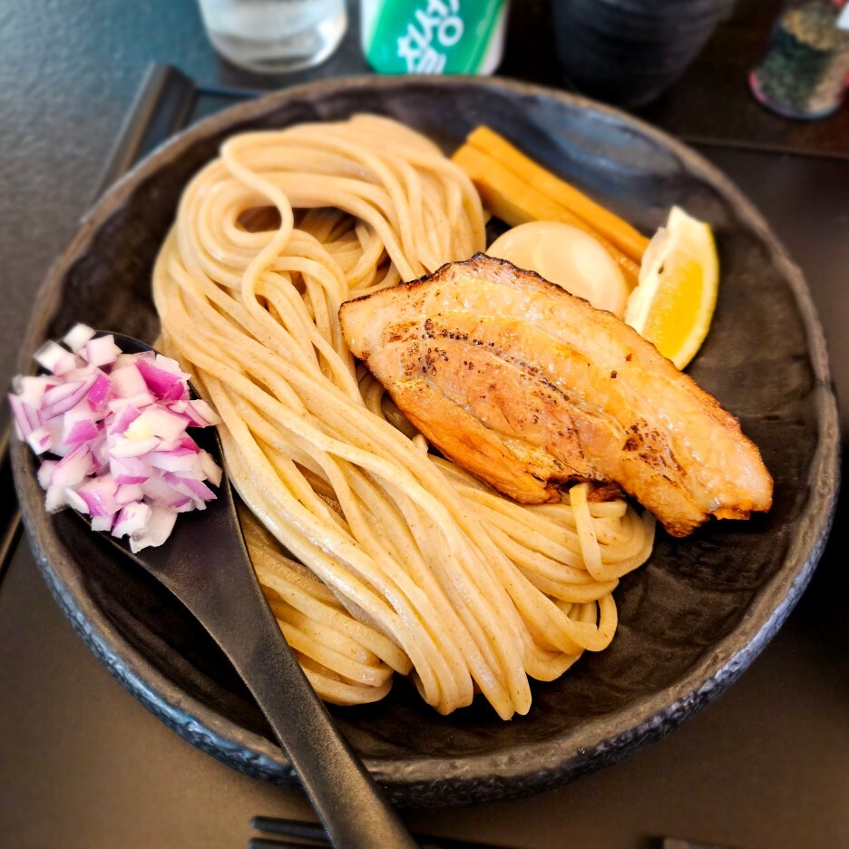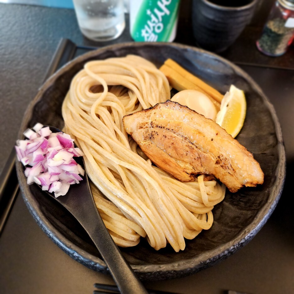 양이 많아 보이는 면과, 츠케 지루. 반숙 달걀 1개, 멘마 2개, 양파와 레몬 슬라이스와 추가한 차슈가 나왔다.