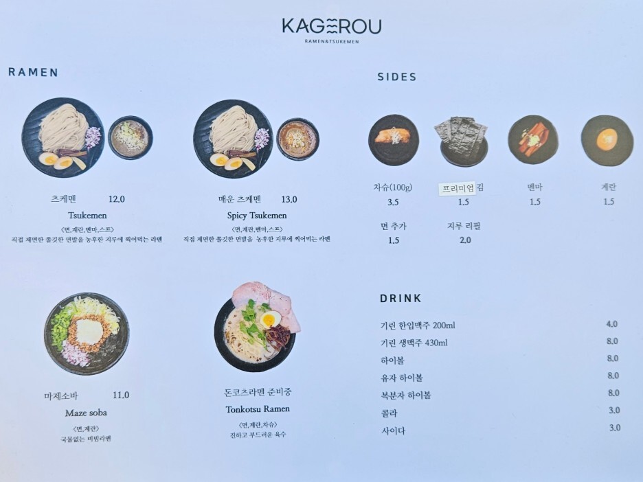 업장을 이전하면 이전의 맛을 놓치는 경우가 종종 있는 것으로 아는데, 여기 카게로우는 이전 토라도라의 맛을 완전 그대로 느낄 수 있어 좋았다. 우리나라에서 이 정도의 퀄리티의 츠케멘을 제공하는 집은 그리 많지 않으리라.