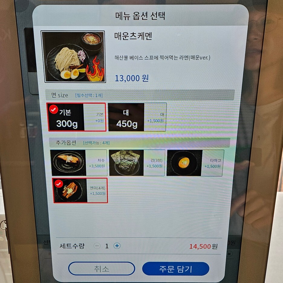 주문은 츠케멘 각 1개씩에 차슈 추가와 멘마 추가(4개)를 선택했다.
