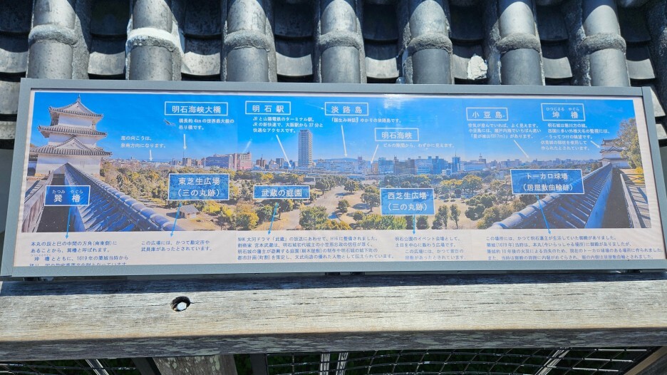 왼쪽의 망루는 히츠지사루야구라(坤櫓) 라는 이름으로, 높이 13.28m의 3층 높이로 웬만한 천수각 규모의 크기이다. 실제로 이 망루는 아카시성의 천수각의 역할을 대신했다고 한다.