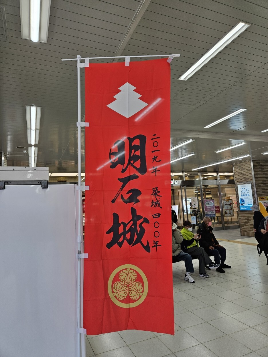 역 바로 앞에 있는 아카시성과 공원이 있다. 이 아카시 성은 1698년에 축성되어, 400년이 넘은 꽤 오래된 성이다. 아카시역 안에도 이렇게 2019년에 축성 400주년이 되었다는 깃발도 있었다.