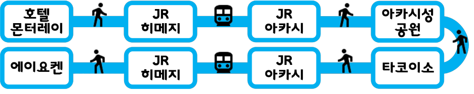 호텔 몬터레이 히메지 → 유니클로 피오레 히메지 → 히메지역 → 아카시역 → 아카시성 공원 → 타코이소 → 호텔 몬터레이 히메지 → 에이요켄 → 호텔 몬터레이 히메지