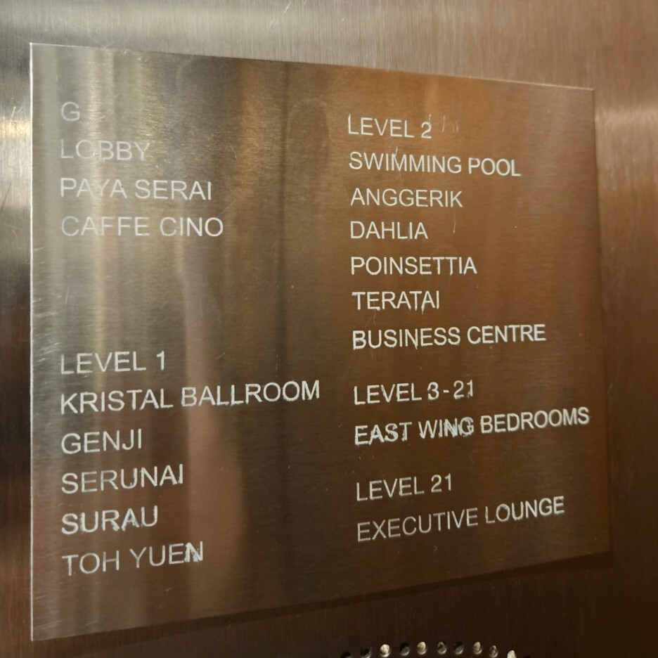 간단한, 층별 안내판. 2층에 실외 풀이 있고, 21층에 이그제큐티브 라운지가 있다.