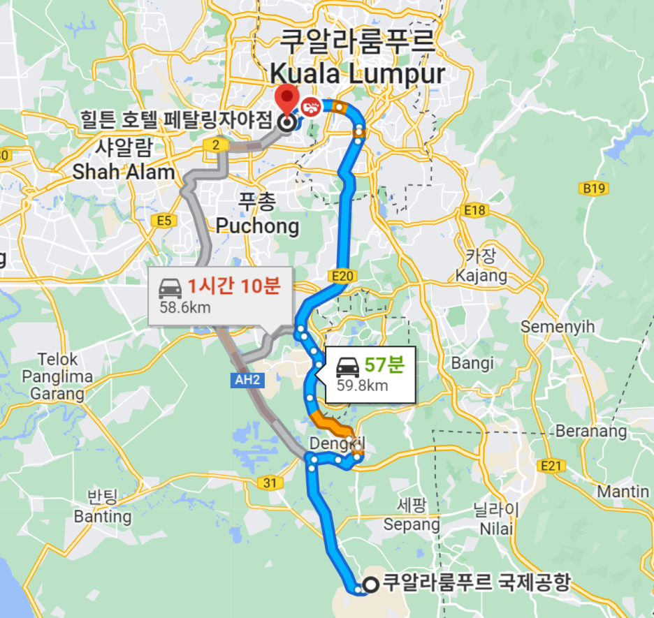 쿠알라룸푸르시내는 공항에서 60km 정도 떨어져 있어, 서울시내에서 인천공항을 가는 거리 정도가 된다. 하지만, 쿠알라룸푸르는 도로 사정이 우리나라처럼 좋은 것이 아니기 때문에 이동 시간이 상당히 많이 걸리는 편이다. 그래서, 밤 늦게 도착하는 비행일정일 경우에는 가급적 빠르게 호텔로 가기 위해서는 조금이라도 가까운 곳이 좋기에 힐튼 페탈링자야가 경쟁력이 있다.
