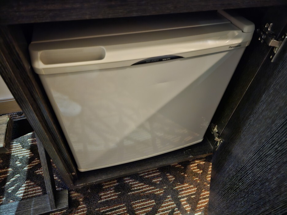 미니바에는 많은 양의 물을 주셨다. 간단한 차와 커피가 있었고, 아래쪽에는 냉장고가 있다.