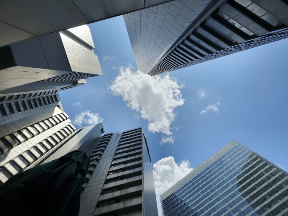 풀에서 하늘을 바라보니, 빌딩에 완전 둘러싸여 있다.