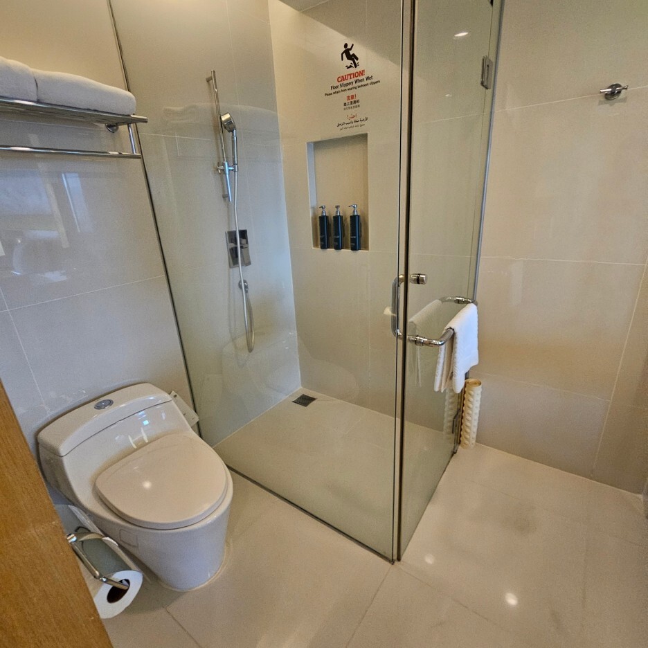 욕실은 욕조는 없이, 세면대와 샤워부스 정도로 구성되어 있는 모습이다. 아주 깔끔하다.