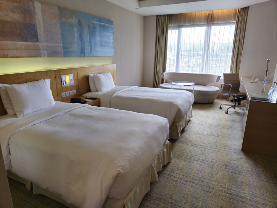 침실에는 트윈 베드와 2인용 소파, 책상과 의자가 있다. 더블트리 바이 힐튼 쿠알라룸푸르는 2010년에 개업했다고 하는데, 13년이 지났음에도 아주 깔끔하고 훌륭한 인테리어였다.