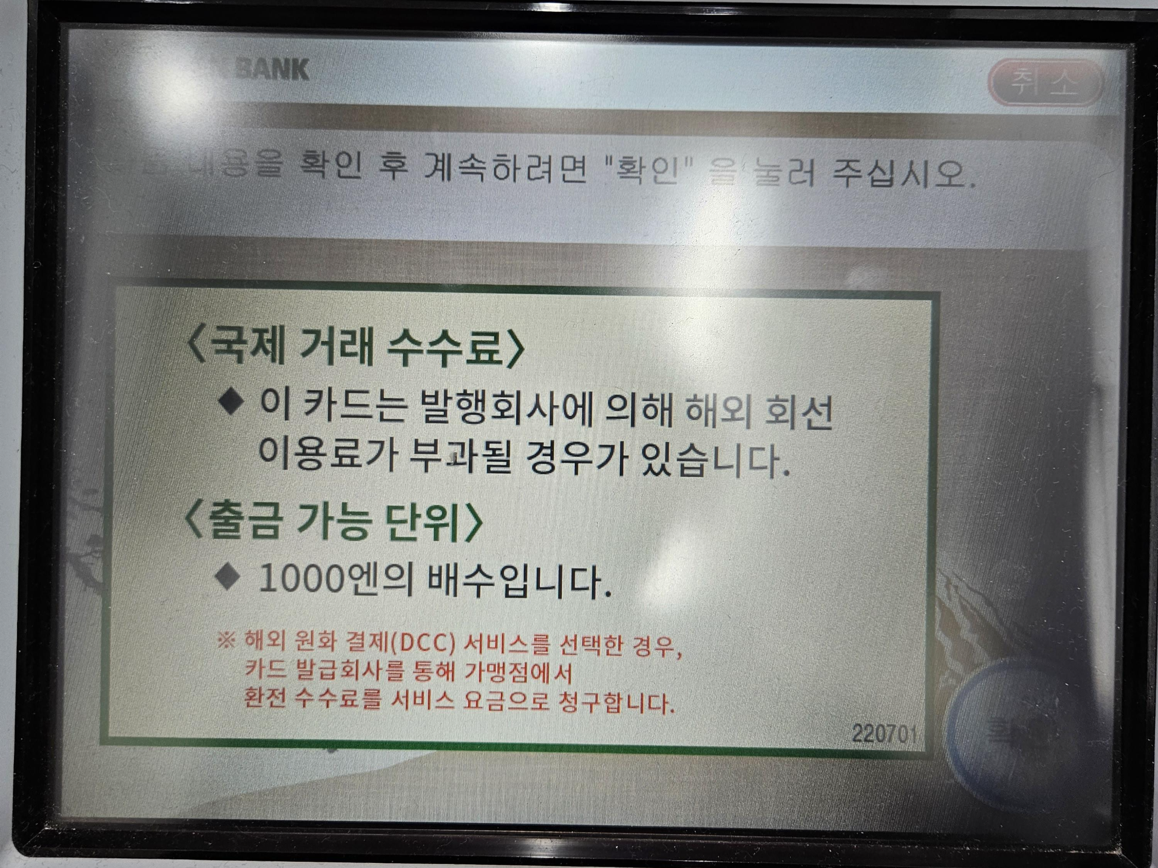 간단한 안내문구가 나온다. 트래블로그 카드를 넣은 것이라면 수수료는 없으니 걱정 마시고 계속 진행하자.