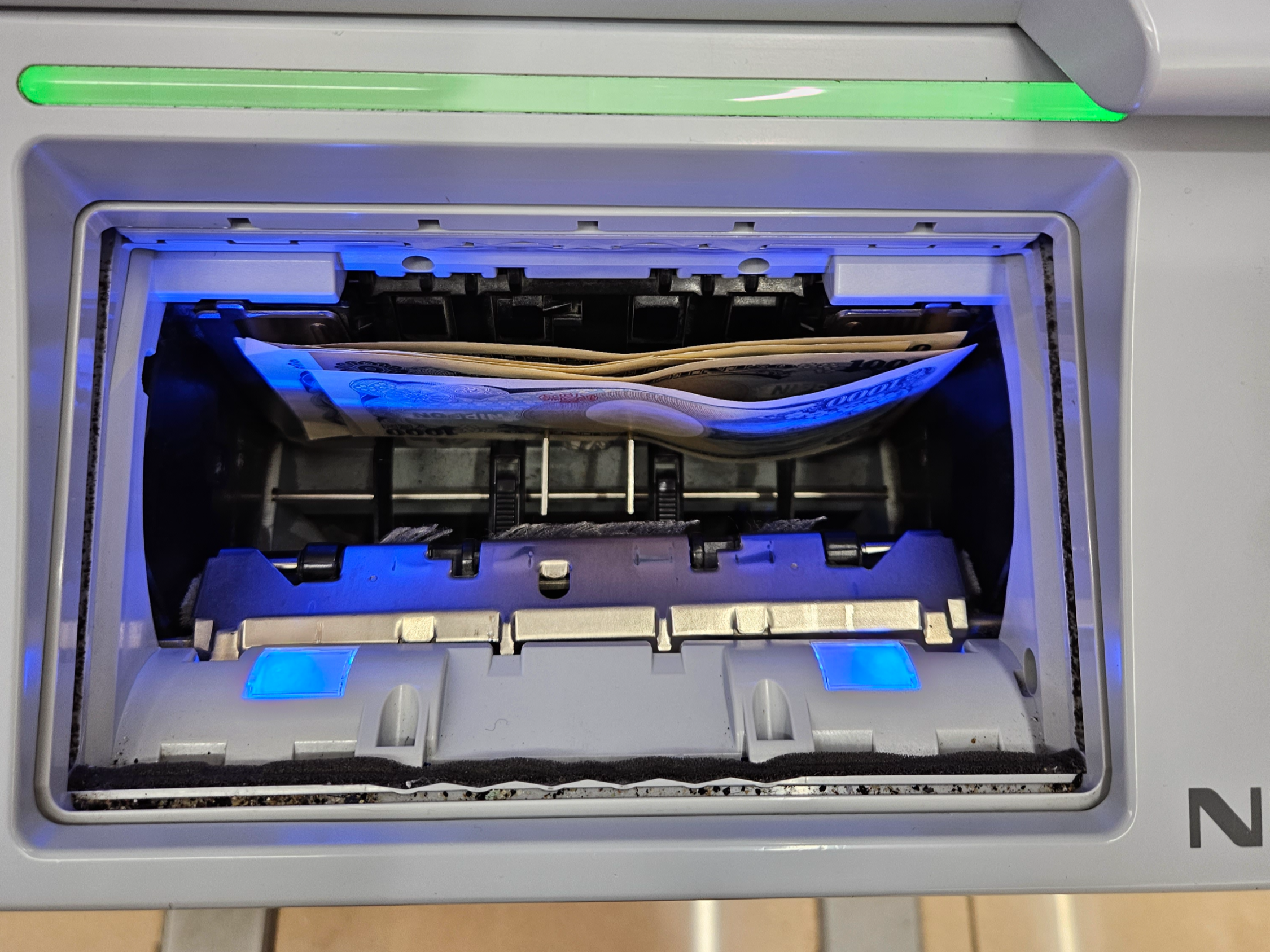 나왔다, 현금. 5천 엔을 인출했고, 천 엔짜리 지폐 5장이 나왔다.