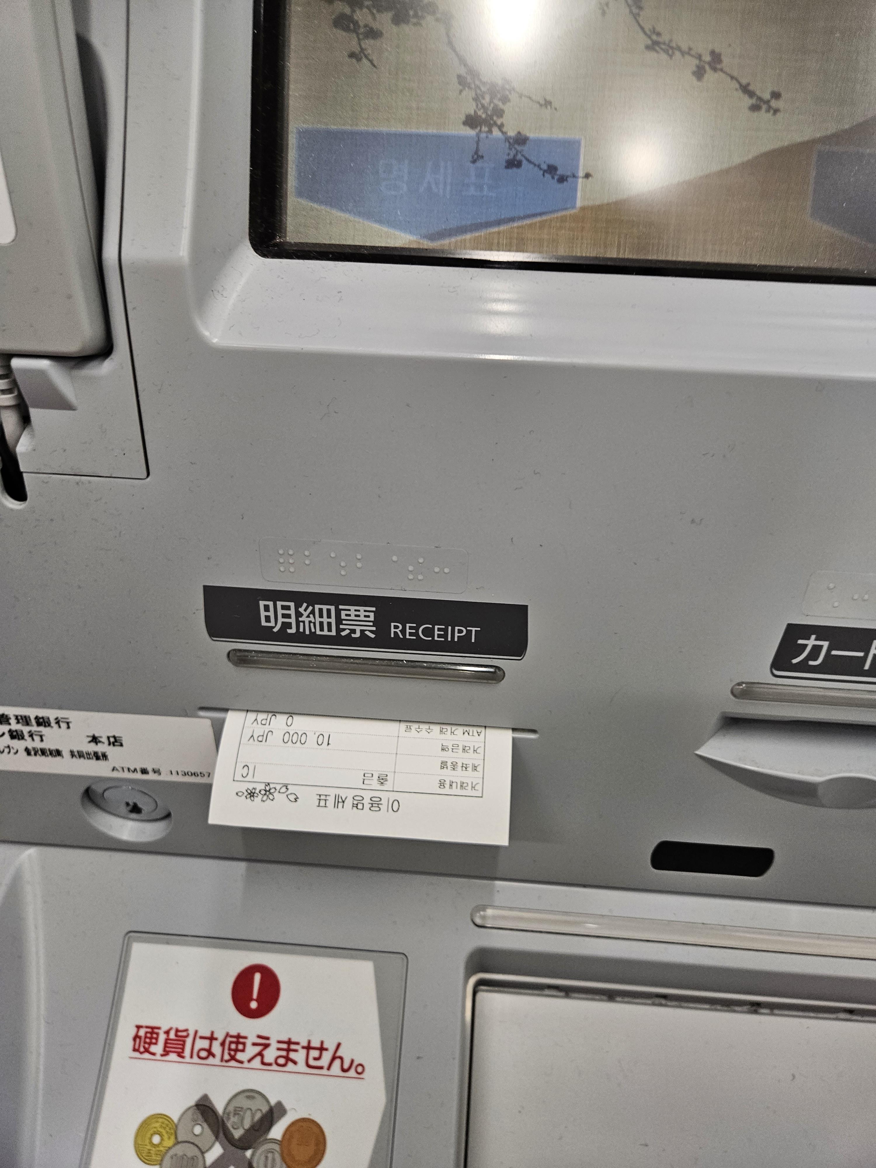 카드와 명세표가 뿅 나온다. 이 두 가지를 뽑으면 그 뒤 현금이 나오게 된다.