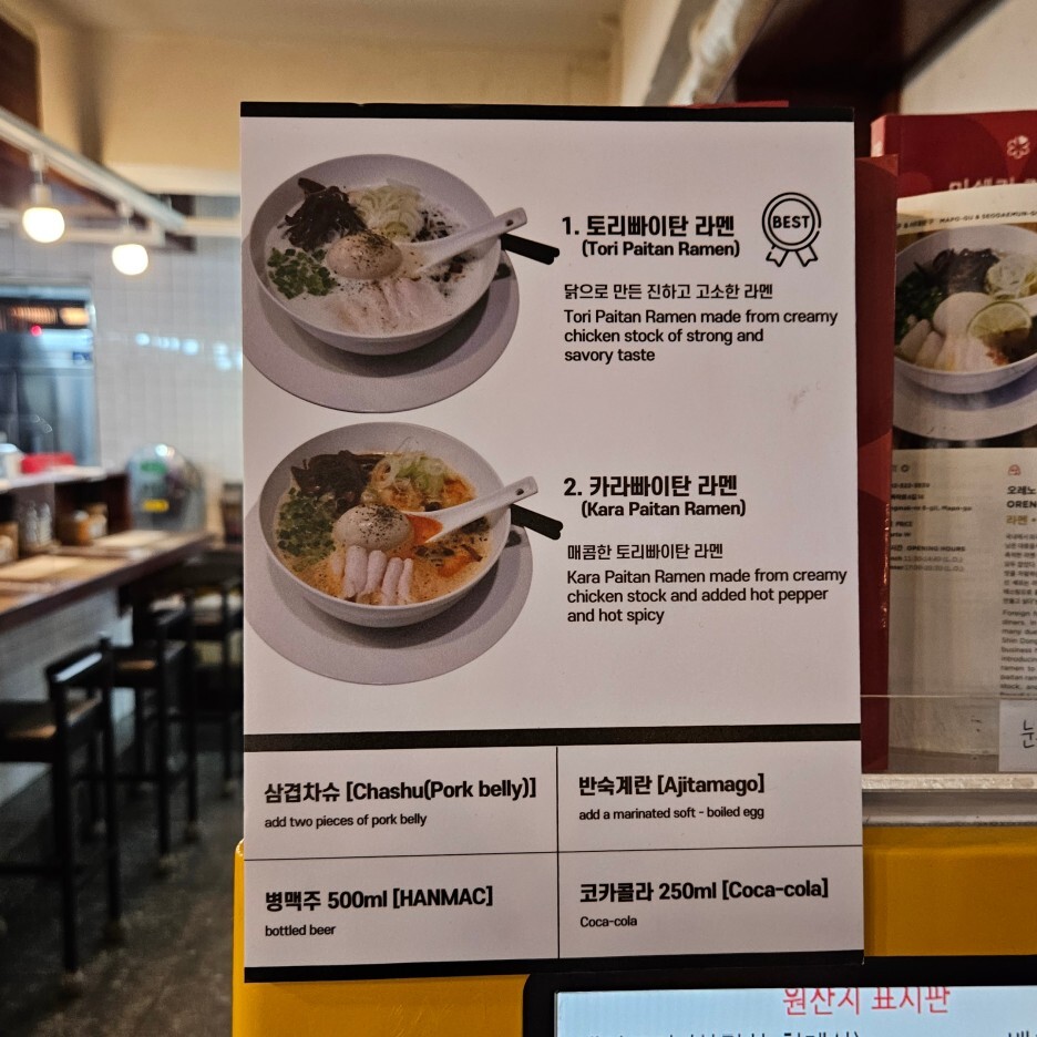 메뉴는 아주 단출하다. 라멘은 딱 2가지뿐. 토리빠이탄과 카라빠이탄 라멘이다. 기본적으로 닭뼈로 국물을 내는 것을 토리빠이탄 라멘이라고 한다.