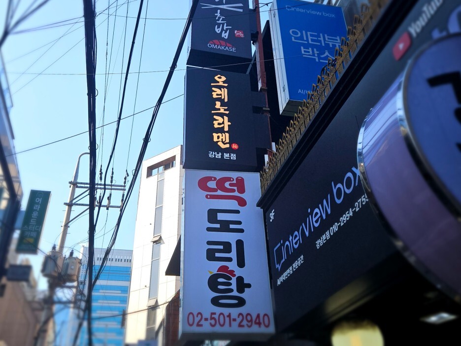 강남점은 CGV 강남 근처 뒷골목에 위치하고 있다. 1층에는 떡도리탕이라는 집이 있는데, 풍자의 또간집에 나와서 손님이 어마어마하게 많은 집이었다. 그래서 항상 오레노라멘도 줄이 긴 것 같은 착시현상이 생긴다.