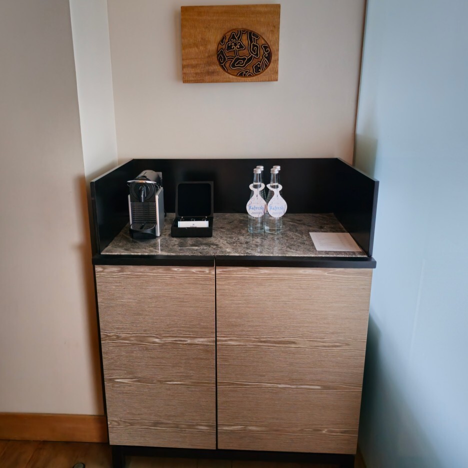 현관문 쪽에 각종 미니바와 냉장고가 있다. 방이 넓다 보니 모든 가구들이 널찍하게 퍼져 있는 형태다.