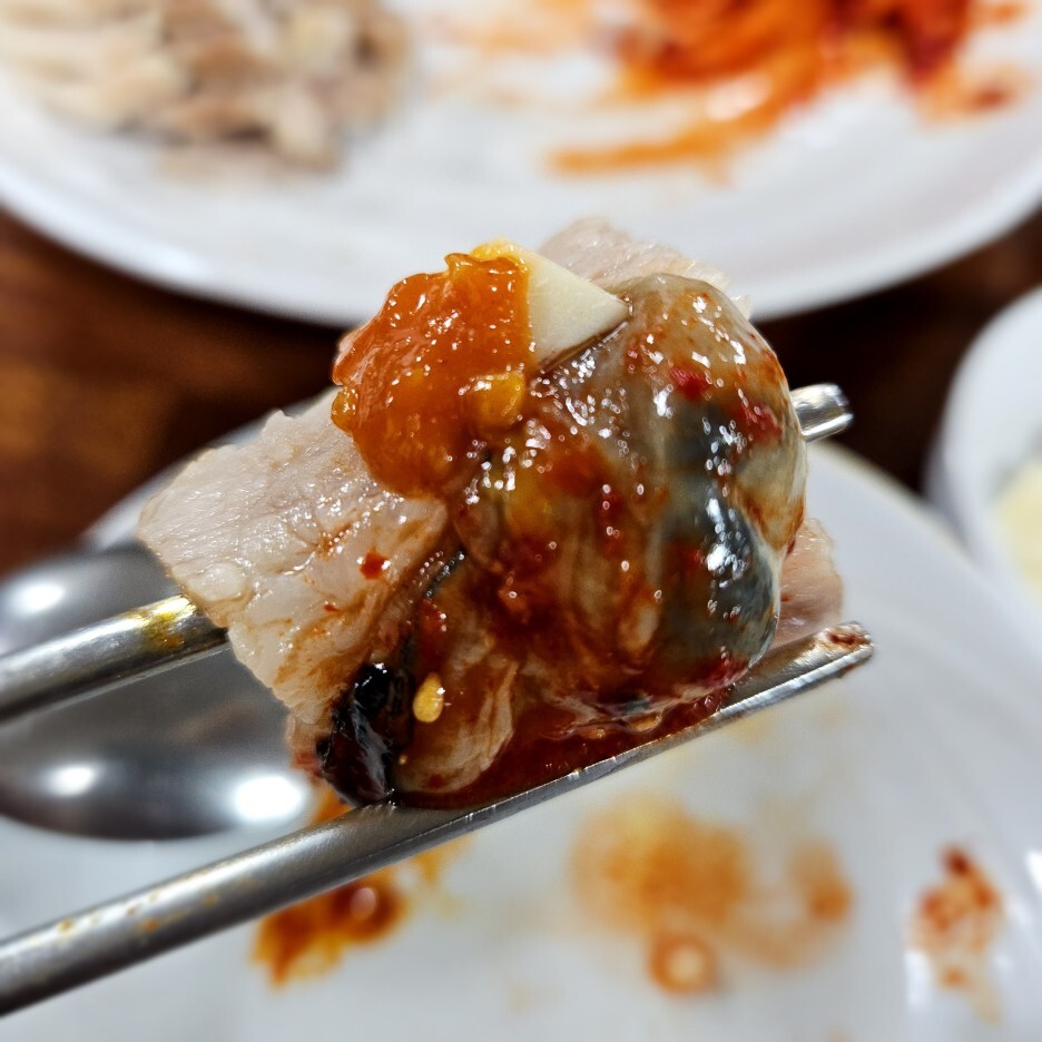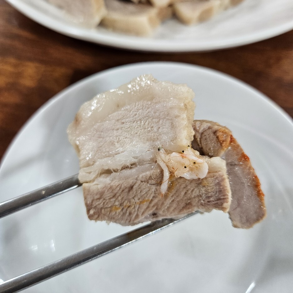 제대로 고기 맛을 느끼기 위해 새우젓만으로 한번 먹어보니, 지방이 있는 부위는 부드럽게 잘 씹힌다. 하지만, 살코기 부분은 질긴 느낌이 강하다. 뭔가 두 부위의 질감이 너무 극명한 차이가 나서 놀라웠다.