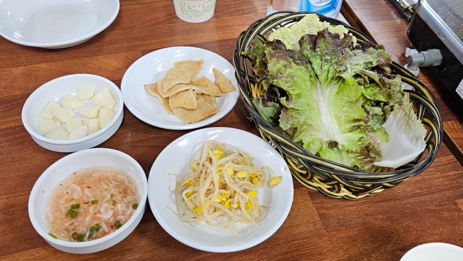 고기, 마늘, 쌈장, 김치를 상추에 싸서 투입하니, 주변 다른 요소들로 인해 괜찮은 맛이다.