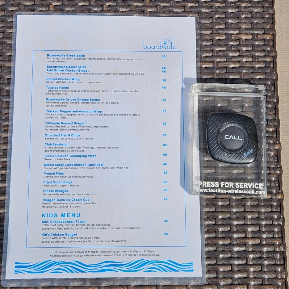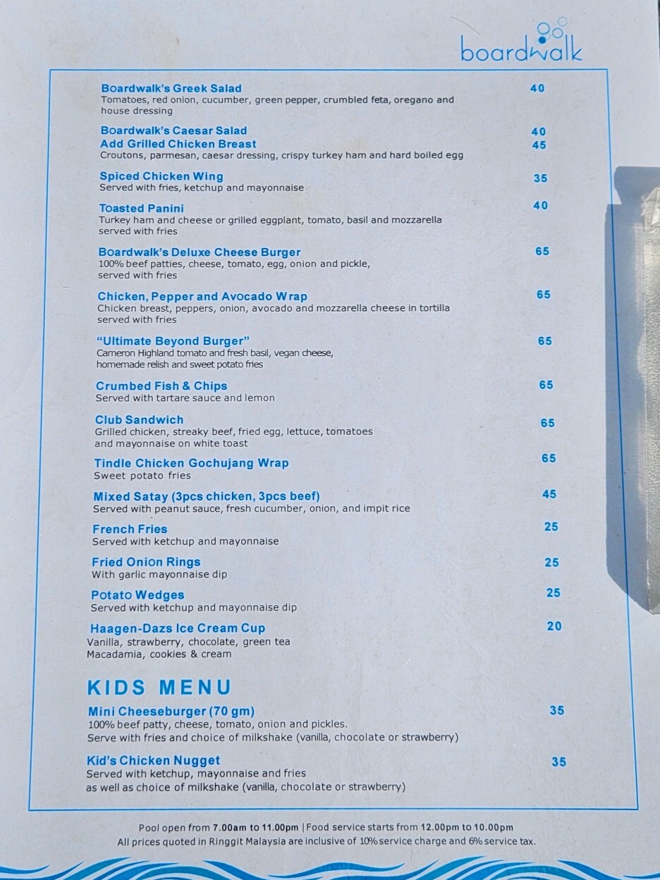 다양한 샐러드, 토스트, 버거 등 수영장에서 먹기에 적당한 메뉴들로 구성되어 있었다. 하지만 호텔이라 역시 가격은 사악하다. 치즈 버거가 19,500원, 감자튀김 7,500원 정도의 가격.