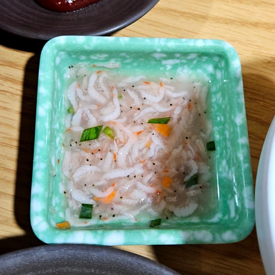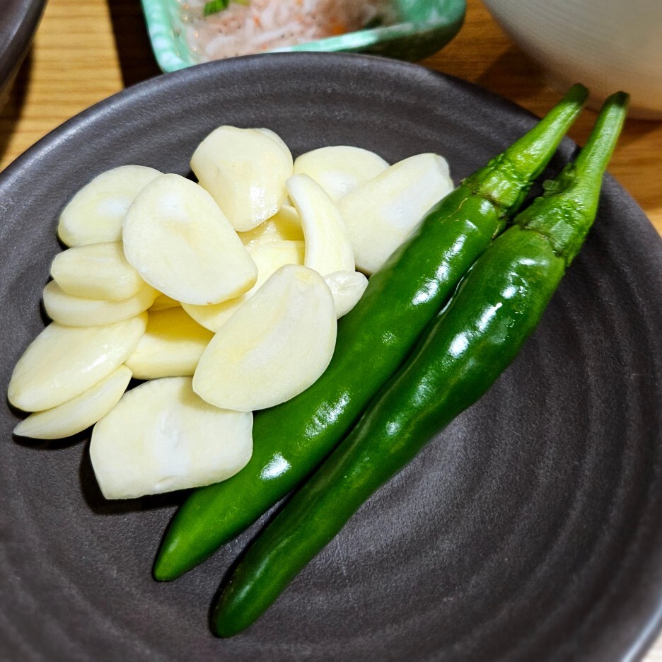 주문 시 나오는 기본 찬들. 일반적인 마늘과 고추, 새우젓. 안타깝게 여기는 쌈 채소는 없다. 좋게 해석하자면 고기와 김치 맛에 집중하기 위해 쌈 싸 먹지 않는 것도 좋은 방법이기도 할 듯.