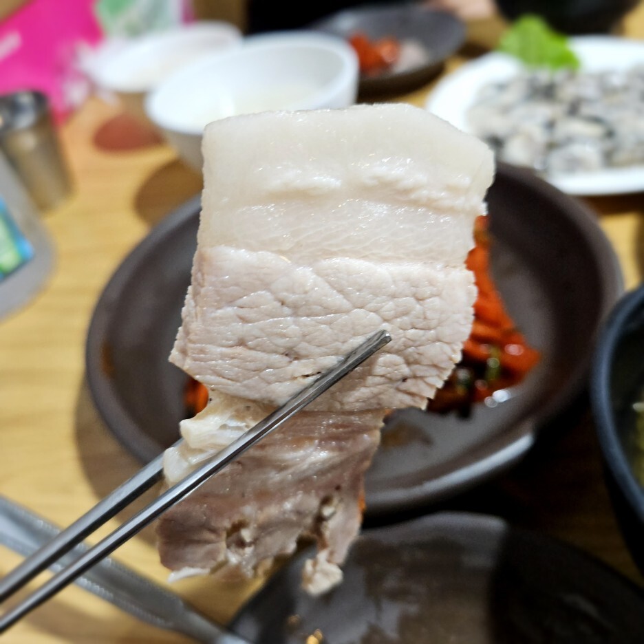 기름진 삼겹 부위 위에 고추장을 찍은 마늘을 올리고, 마지막으로 생굴을 턱 올린다.