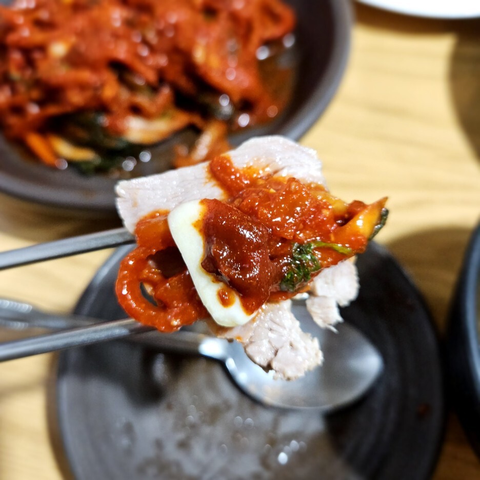 뭐니 뭐니 해도 이 보쌈 고기의 퀄리티가 아주 훌륭하다. 삼겹 부위는 아주 적절하게 지방과 고기가 황금비율로 섞여있다. 그냥 입에 넣으면 부드러움과 지방질이 가득 차는 느낌.